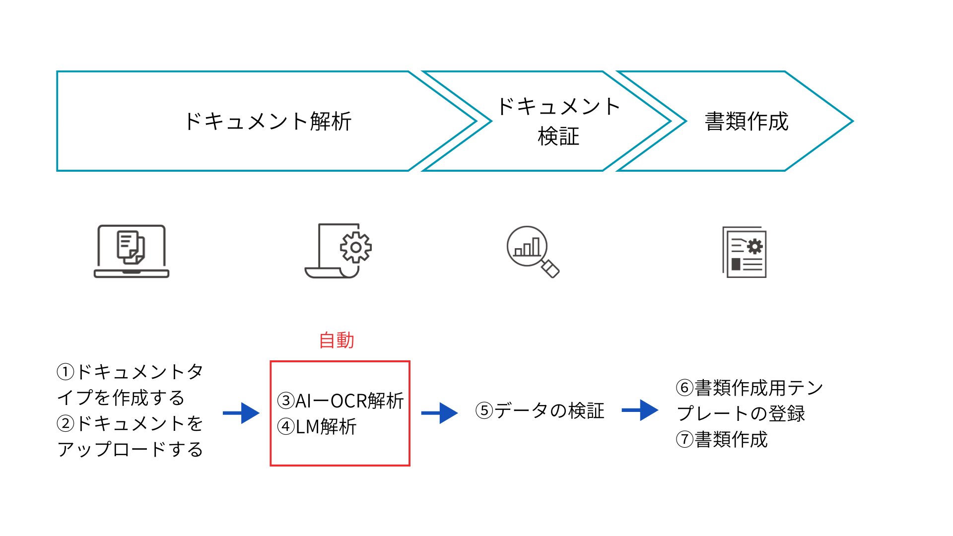 ドキュメントフォースの「ドキュメント解析」「ドキュメント検証」「書類作成」の3つの機能を利用することで、フォーマットの定型・非定型を問わずに、様々なドキュメントを自動的に構造化し、なおかつそのデータをサービス内で検証でき、さらに新たなフォーマットの書類の作成までを一貫してサービス内で完結させることができます。