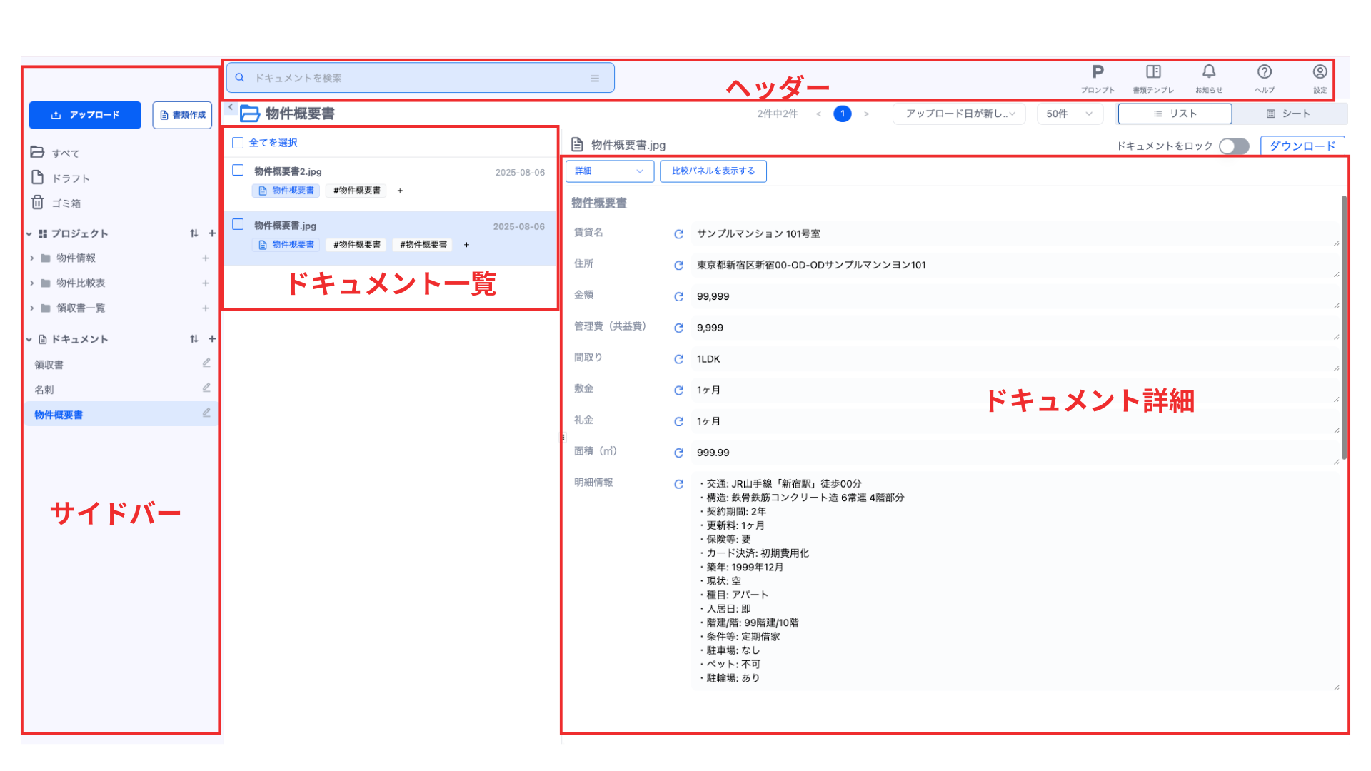 AI-OCRによって抽出されたテキストに対して、ドキュメントタイプに設定された「解析項目」と「プロンプト」を基に生成AIがドキュメントを解析します。