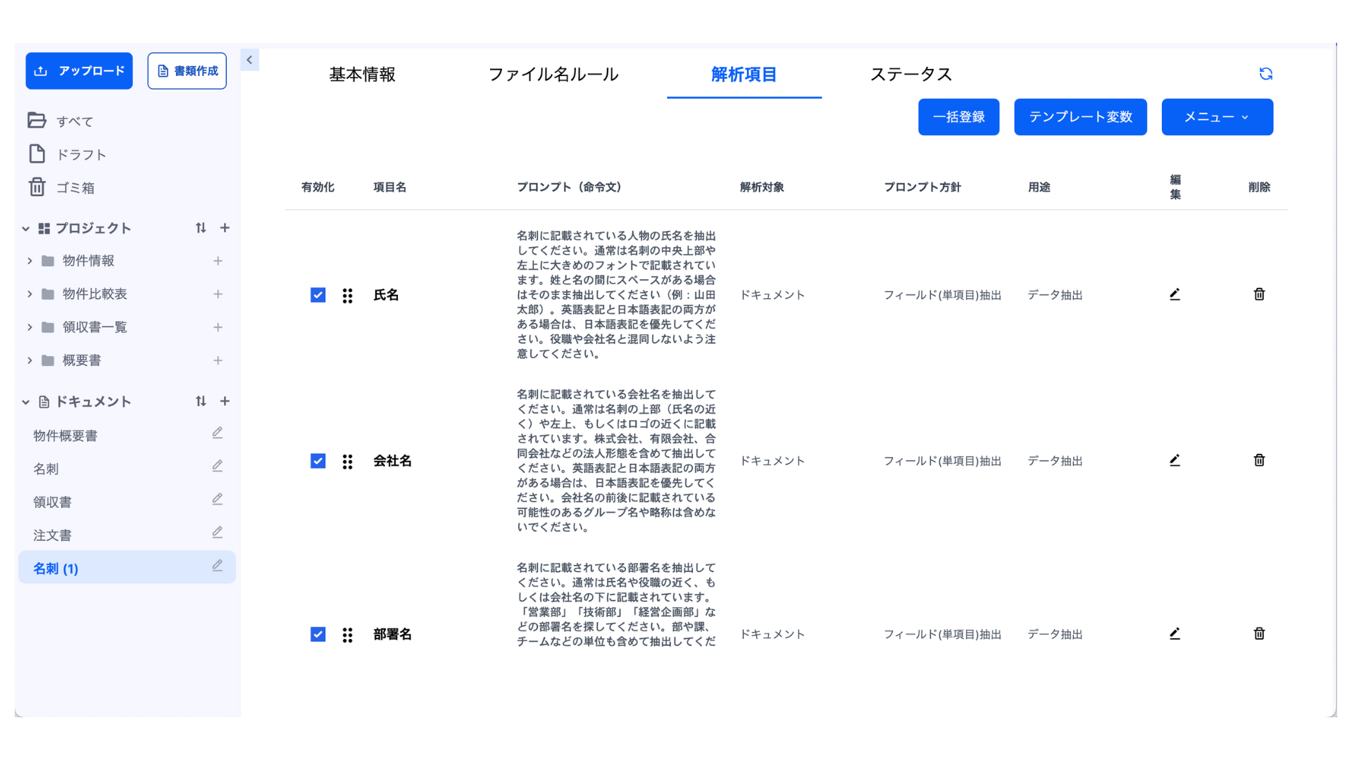 自動作成された解析項目やプロンプトを変更、修正したい場合は、それぞれの解析項目の編集をしてください。
