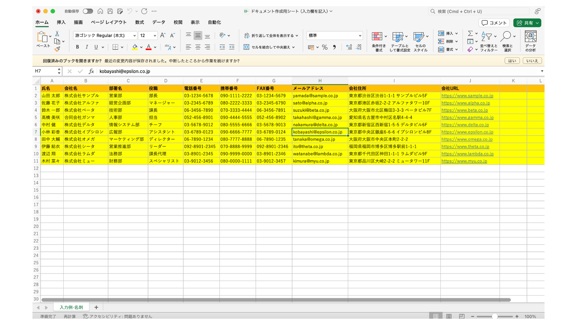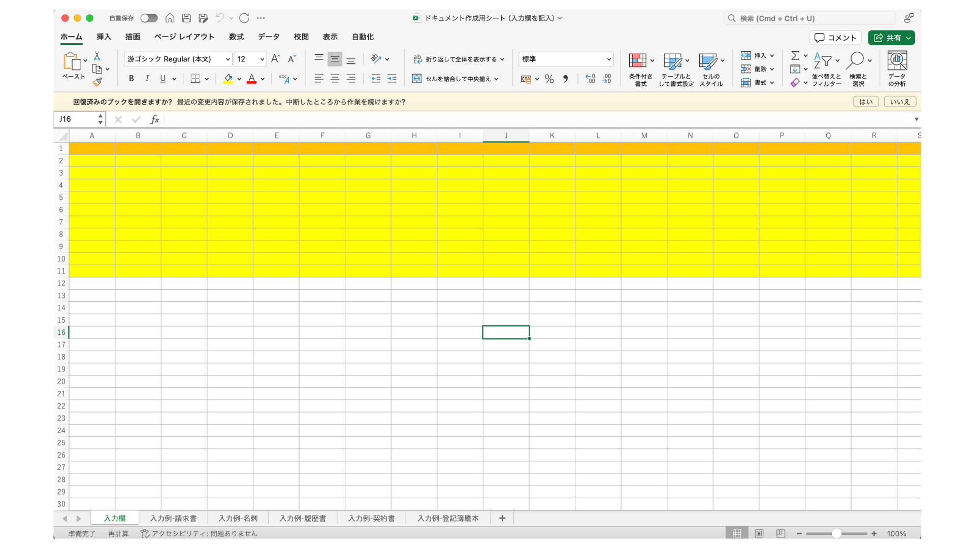 ドキュメントタイプ作成用シートをダウンロードすると、「ドキュメント作成用シート(入力欄を記入).xlsx」ファイルがダウンロードされます。