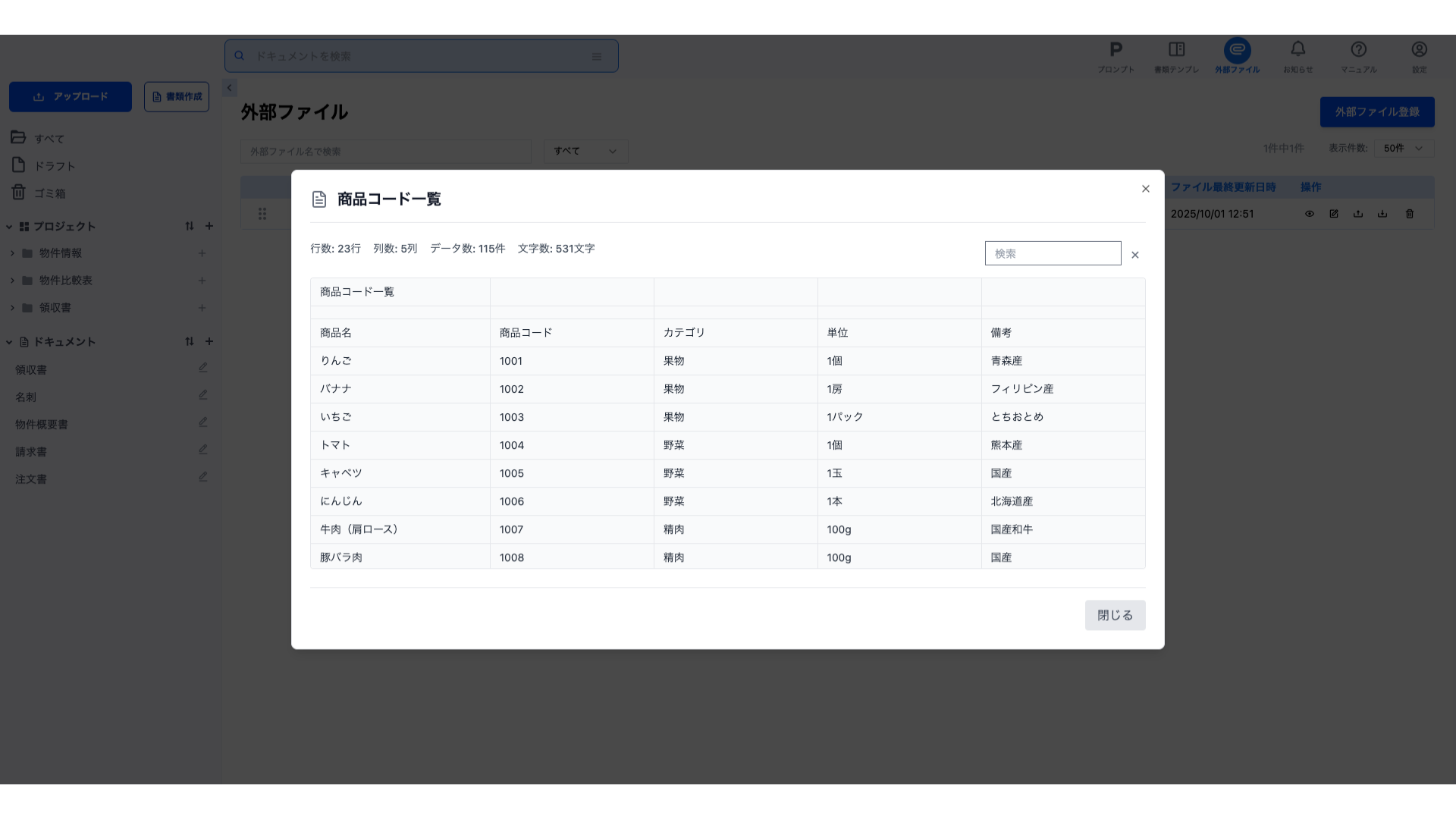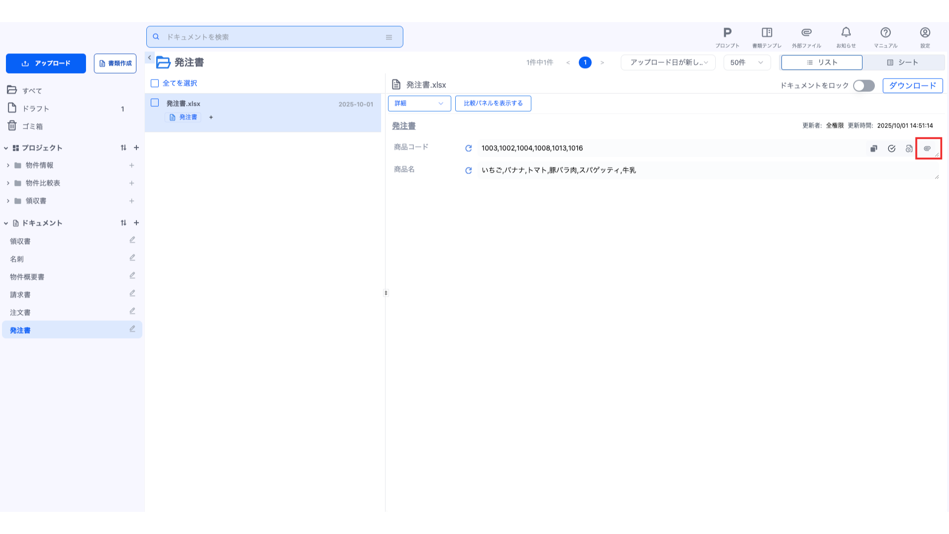 ドキュメント詳細画面にて、解析項目が外部ファイルを参照している場合は、解析結果に「外部ファイル」アイコンが出現します。