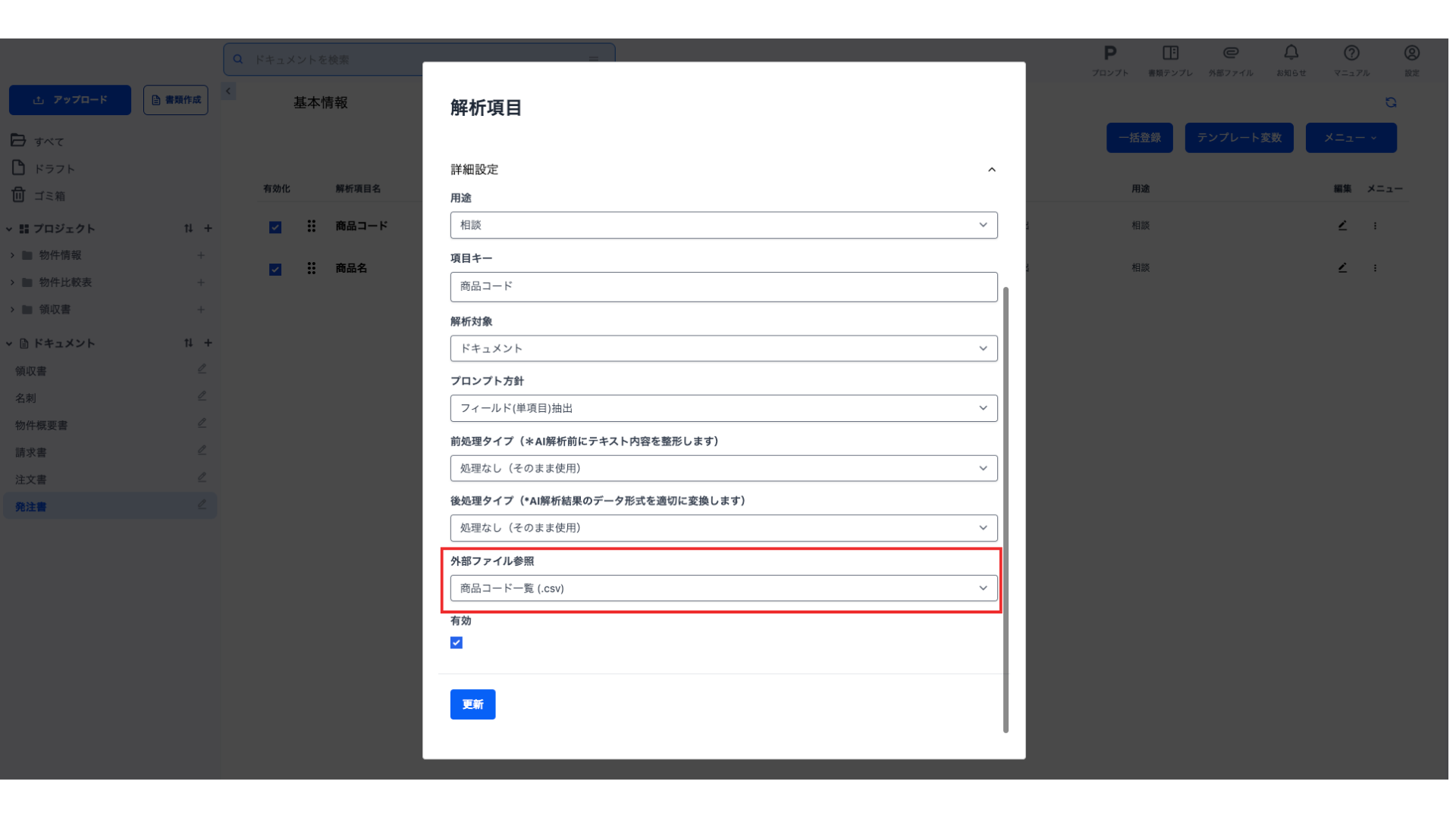 ドキュメントタイプの解析項目が外部ファイルを参照するためには、解析項目の編集画面を開き、「外部ファイル参照」を設定します。