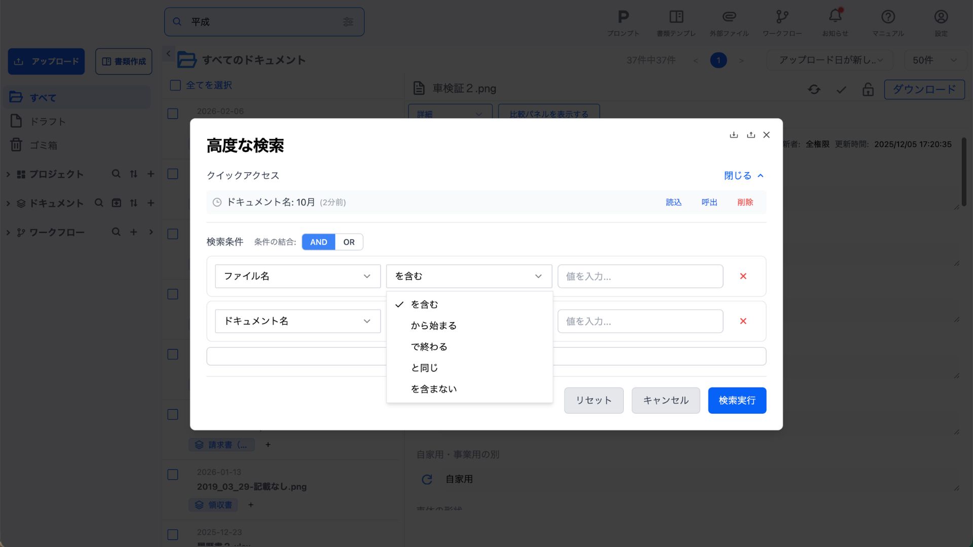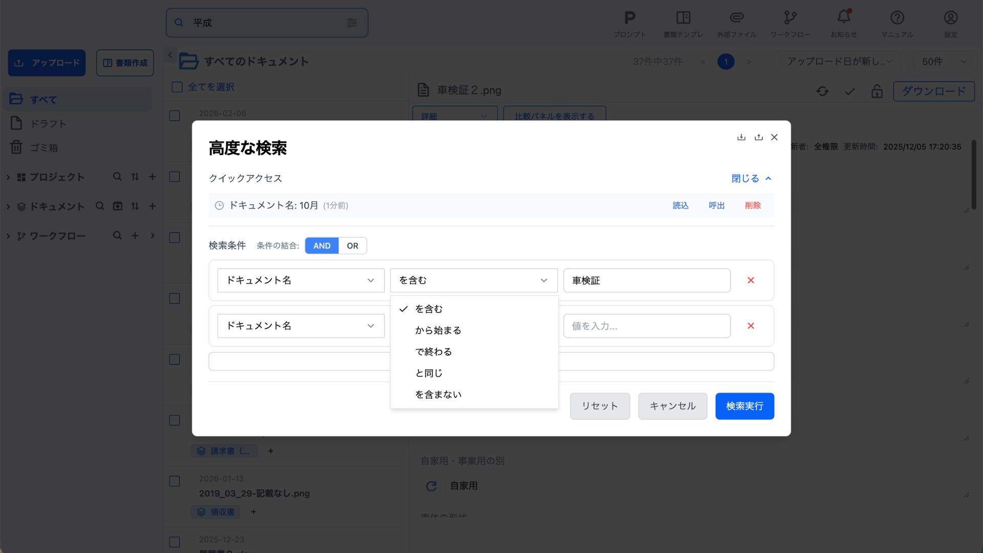 登録されているドキュメント名に以下の条件でキーワード検索ができます。