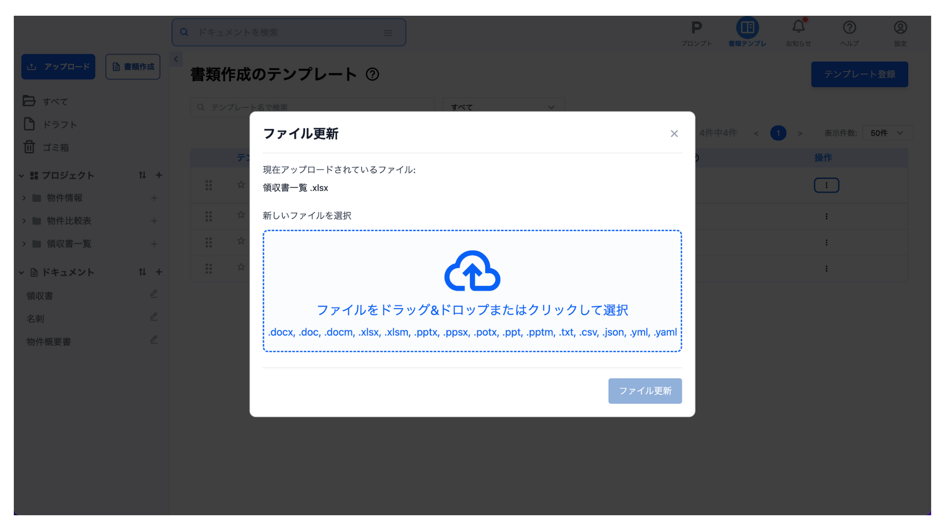 作成したテンプレートとなるファイルをアップロードすることで、書類作成用のテンプレートを登録できます。