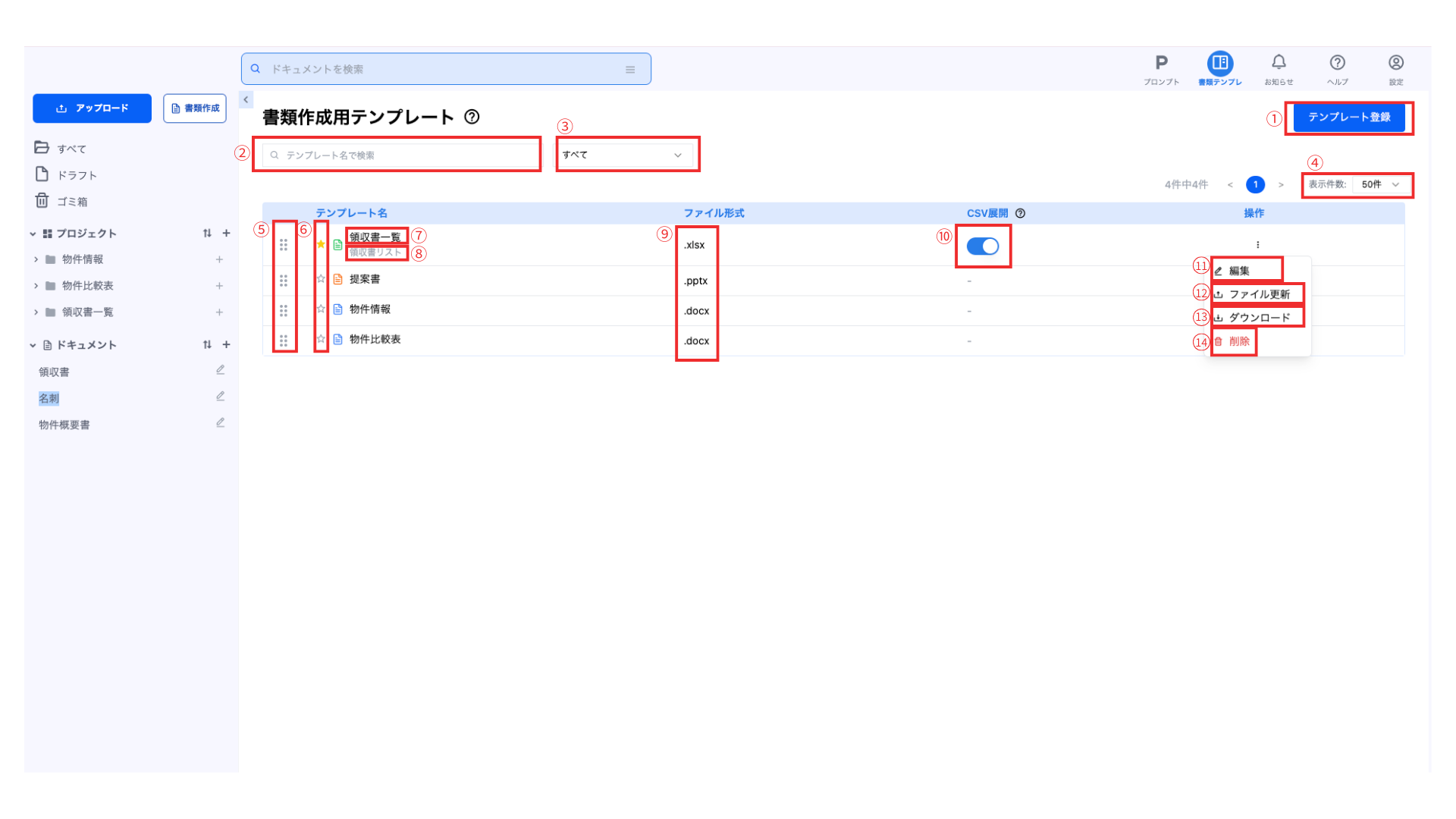 テンプレート名(変更可能) | 登録されているテンプレートの名称であり、サービス内のみで利用される名称です。テンプレート名は検索対象となりますので、書類作成用テンプレートの一覧画面や書類作成時に管理しやすい名称をつけることをおすすめします。 |