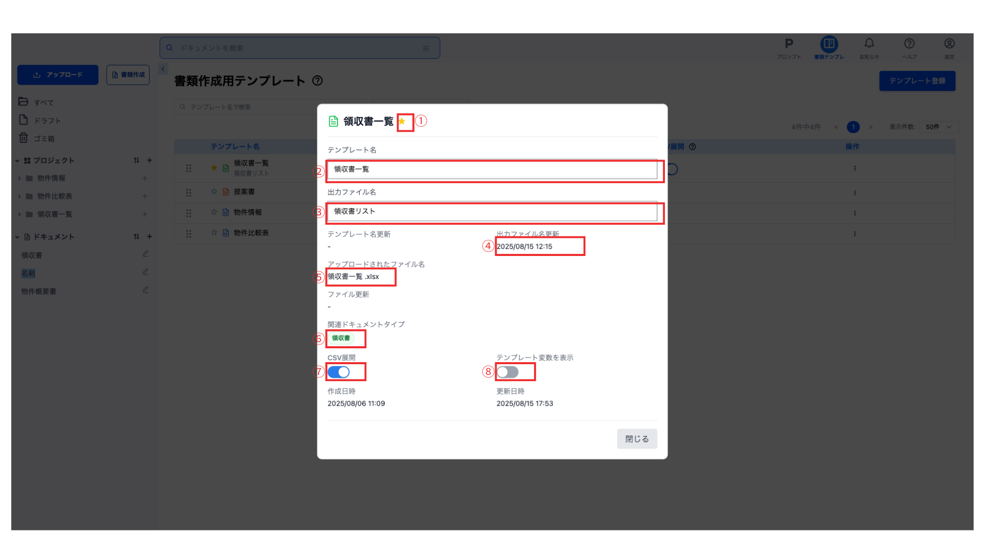 書類作成時の出力ファイル名(変更可能) | 書類作成時に出力されるファイル名です。書類作成時の出力ファイル名は書類作成時のみ利用され、ファイル名にはテンプレート変数を含むこともできます。 |