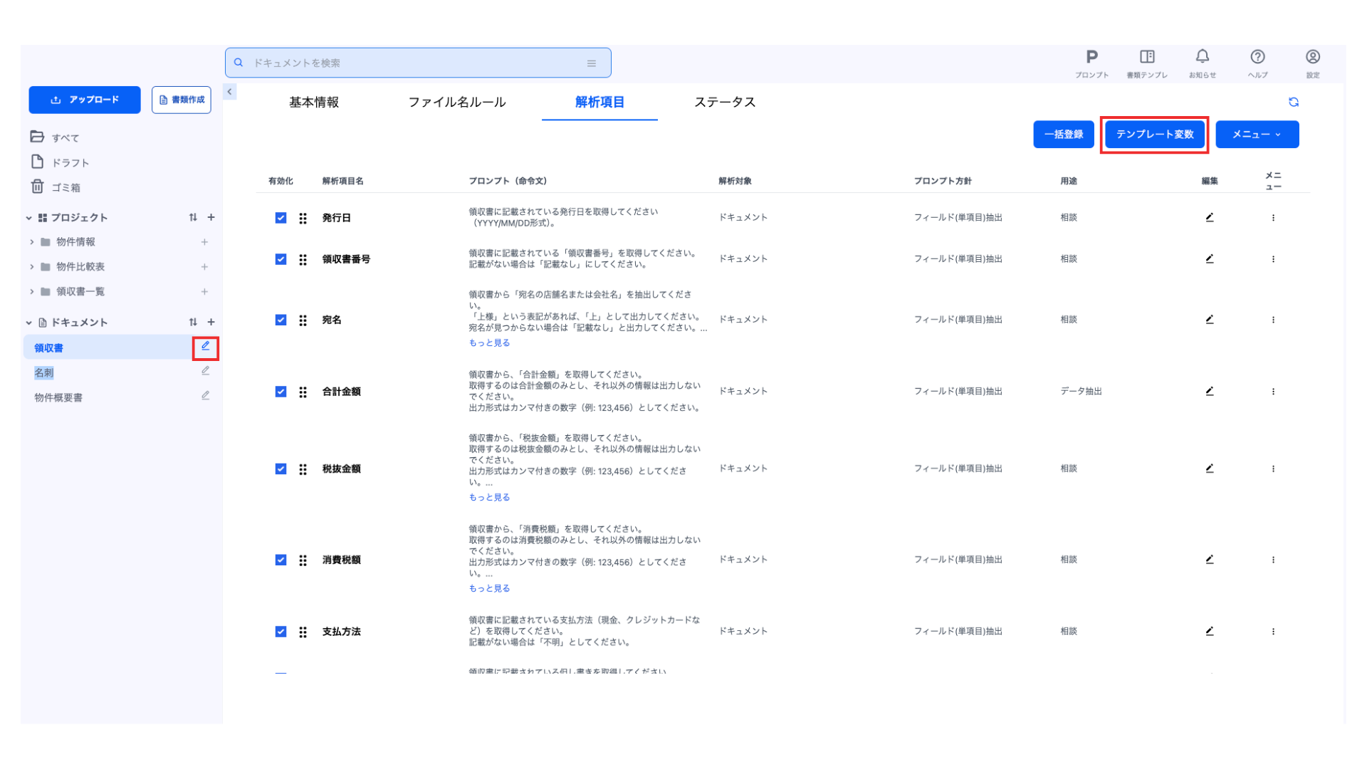 テンプレート変数は、ドキュメントタイプの編集画面から確認することができます。