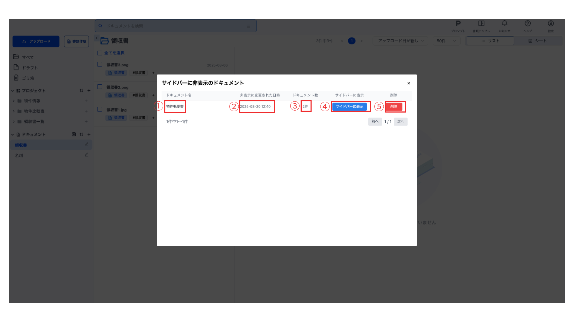 ドキュメントタイプをサイドバーから非表示にします。非表示にされたドキュメントタイプはサイドバーから非表示になりますが、登録されているドキュメントタイプや解析結果が削除されることはありません。