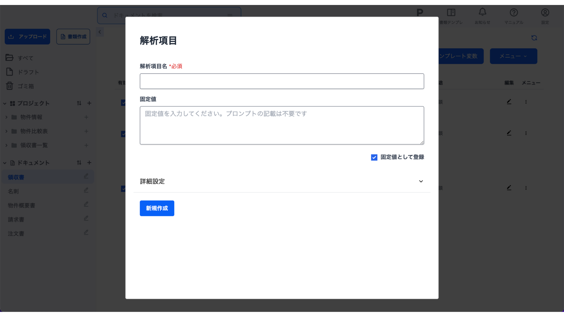 ドキュメント解析時は固定値に入力された値が常に解析結果として出力されます。また、固定値を入力せず空白のまま登録した場合は解析結果も常に空白で出力されます。