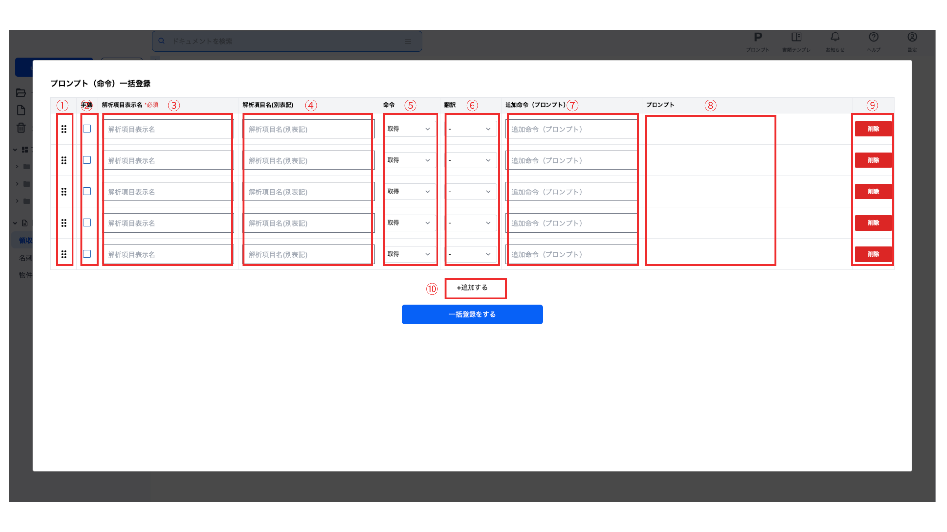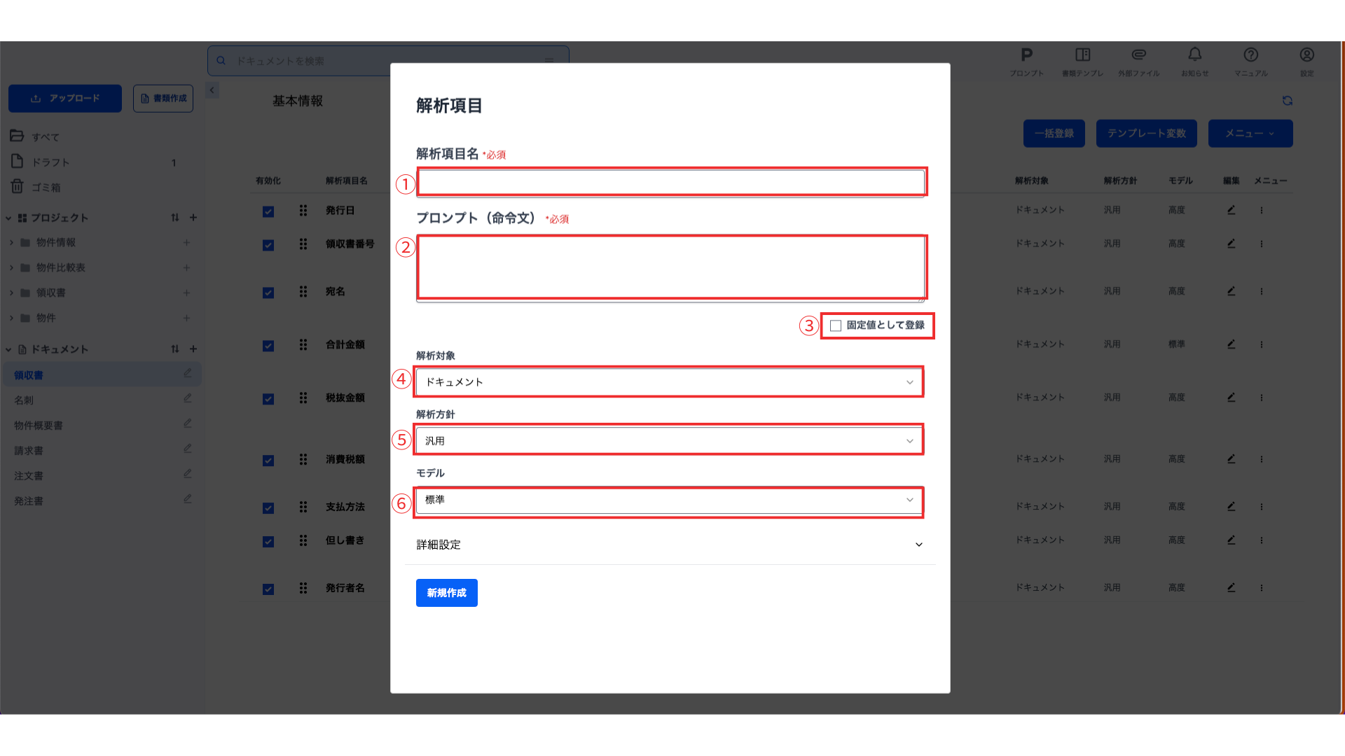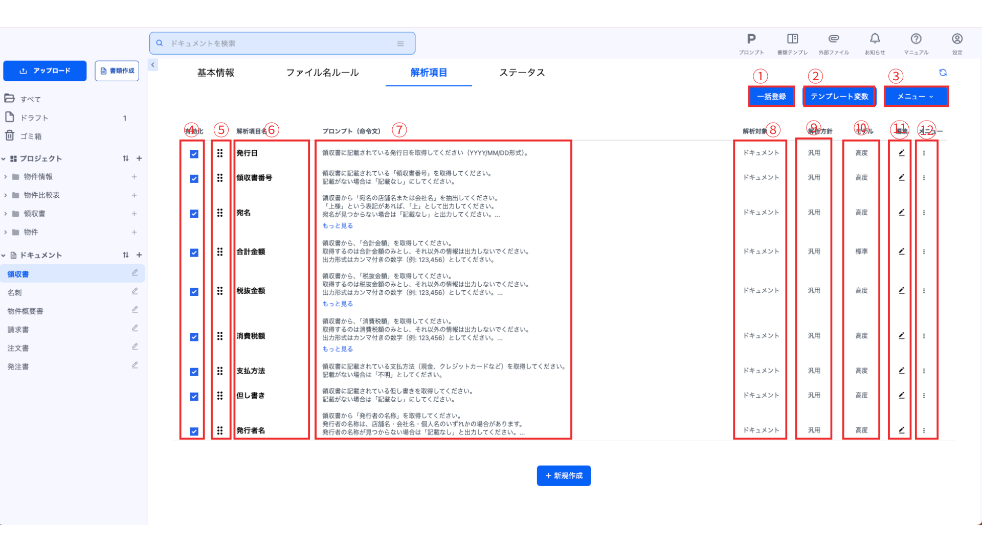 ドキュメント解析に使用する解析項目とプロンプト(命令文)等を設定できます。