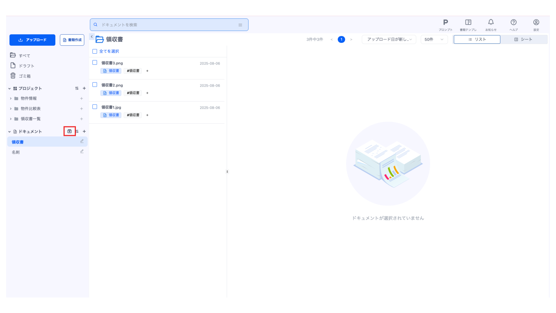 並び替えボタンがアクティブ(青い背景になっている状態)であれば、ドキュメントタイプの並び替えができます。