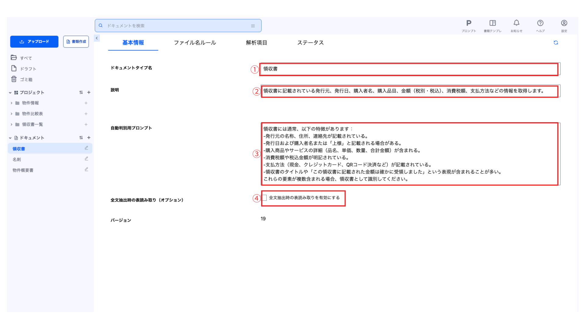 ドキュメントタイプの編集では「基本情報」「ファイル名ルール」「解析項目」「ステータス」の4つの項目を管理できます。
