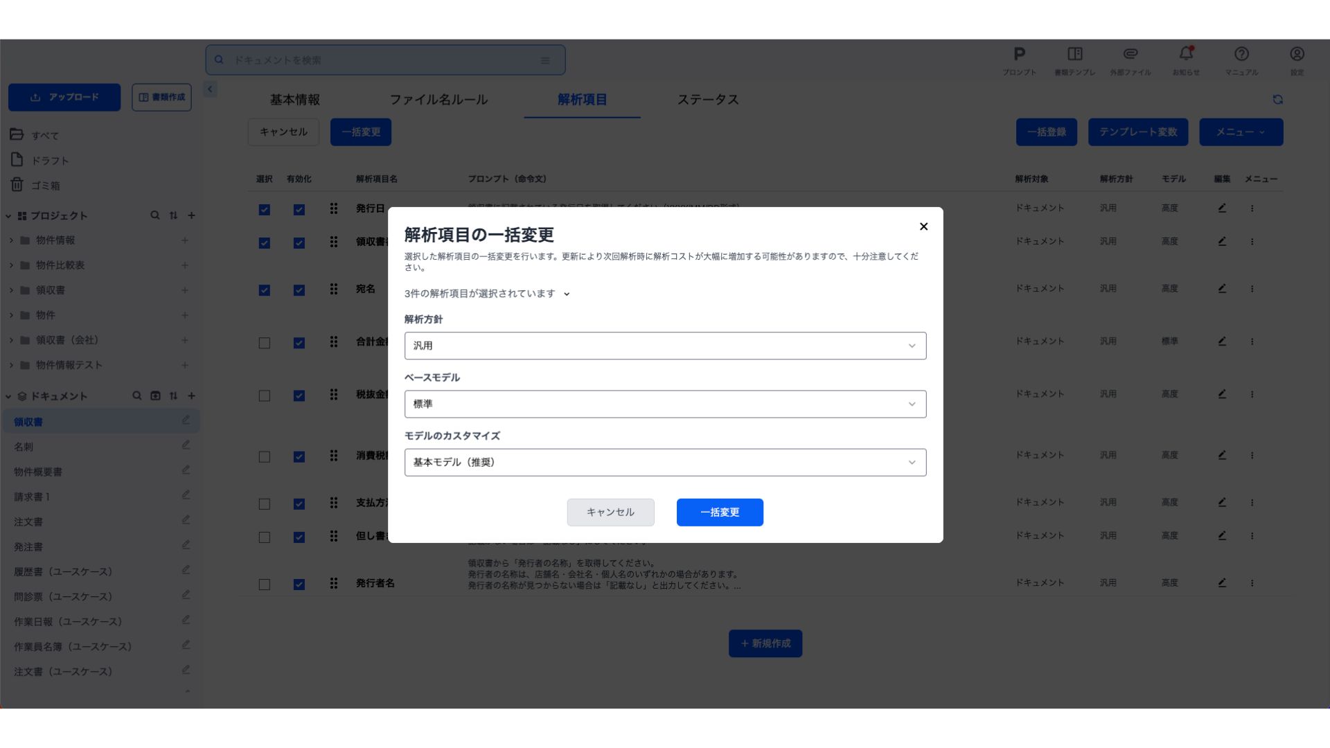 解析項目の一括変更画面では、選択された解析項目に対してまとめて「解析方針」「モデル」「モデルのカスタマイズ」を変更することができます。