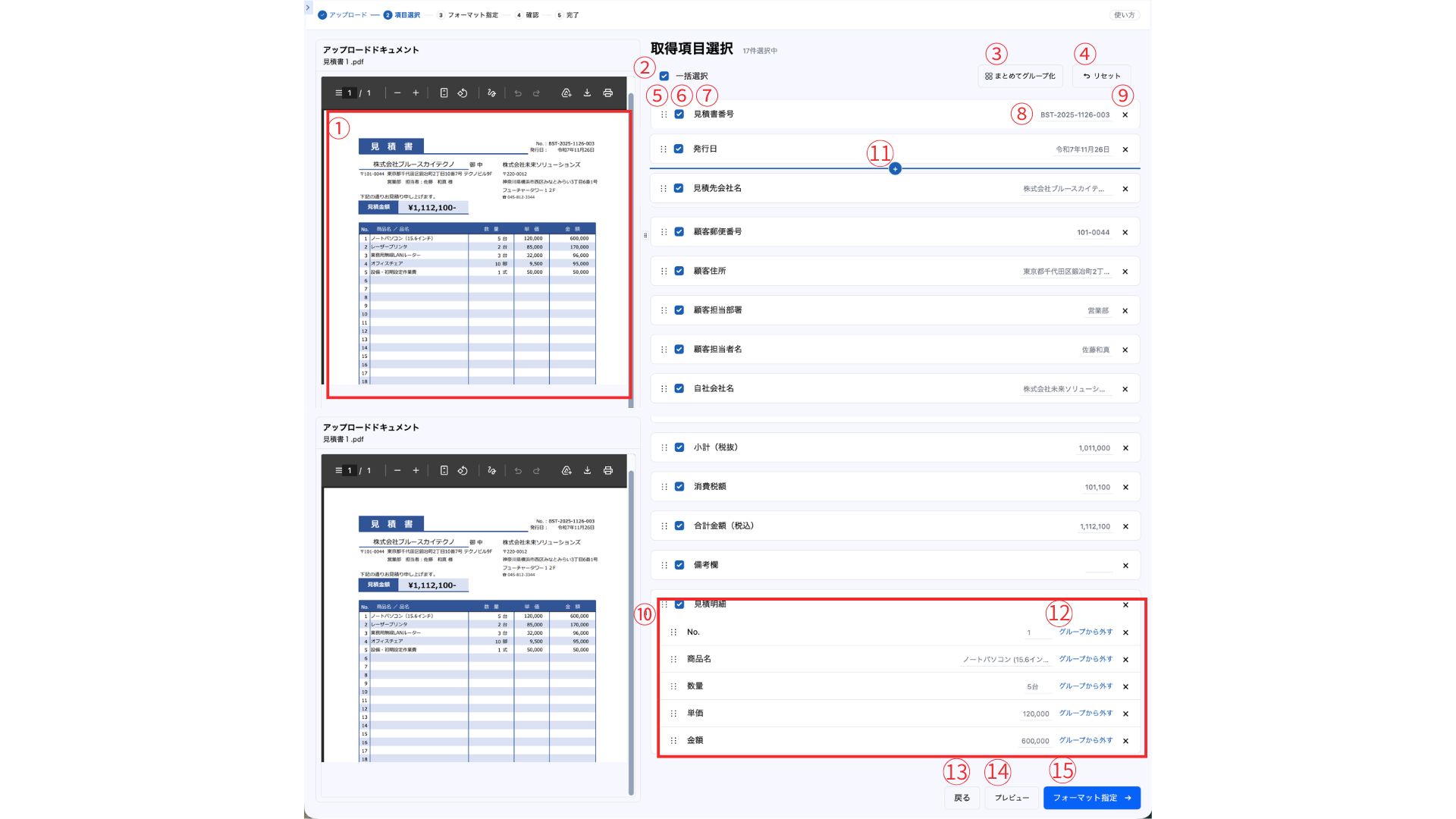 ドキュメントの解析が完了すると、取得項目選択画面が表示されます。