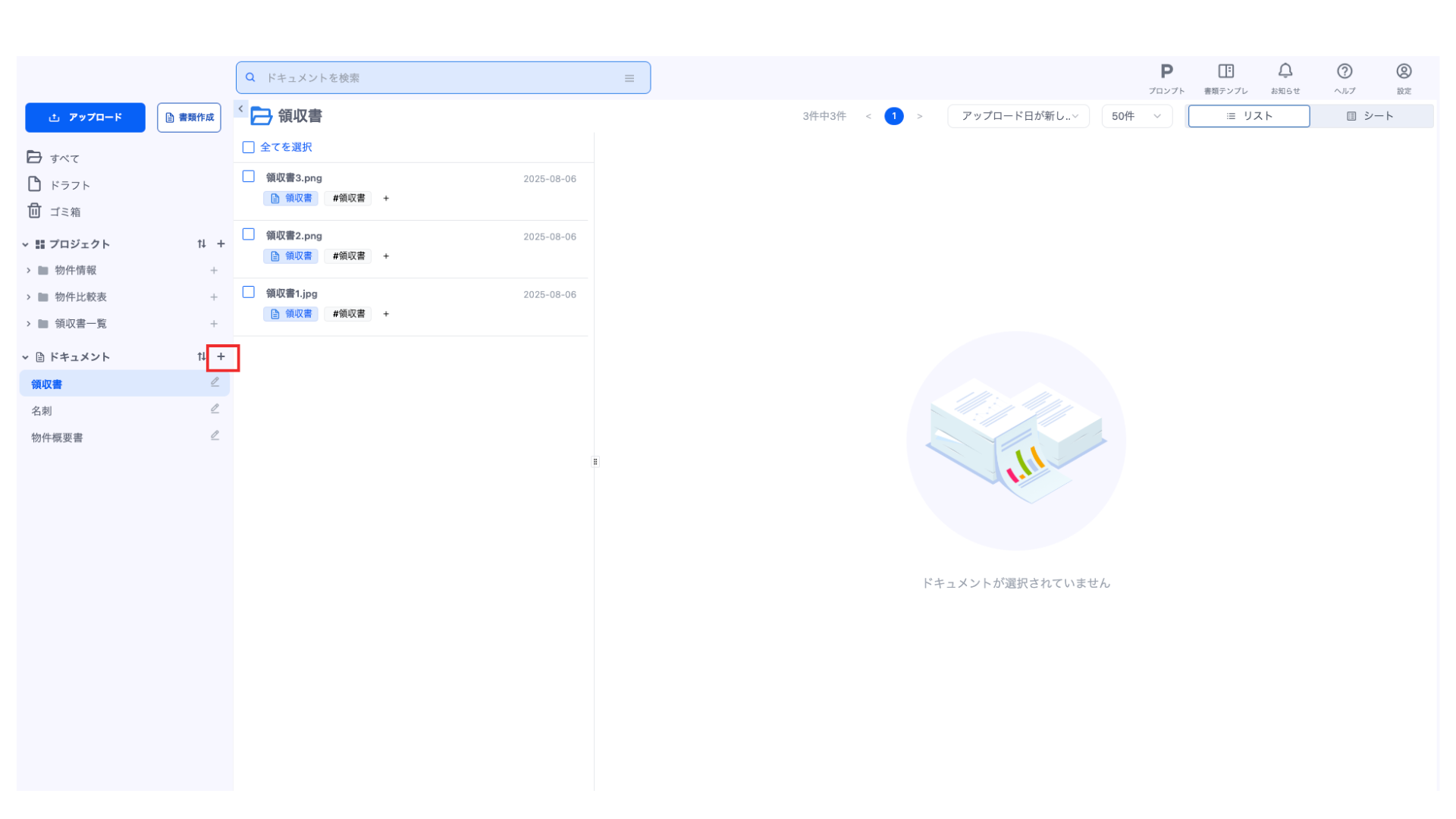 ドキュメントタイプを手動で作成したい場合は、新しいドキュメントタイプはサイドバーのドキュメントの「+」ボタンから作成できます。