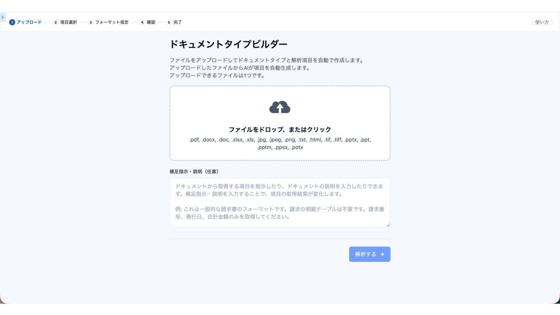 ドキュメントタイプビルダーでは、アップロードされたドキュメントから抽出できる項目をすべて取得するようにAIに対して指示がされています。ただし、ドキュメント解析前に取得したい項目が決まっている場合や、アップロードするドキュメントに対して補足説明等がある場合は「補足指示・説明(任意)」を追記することができます。