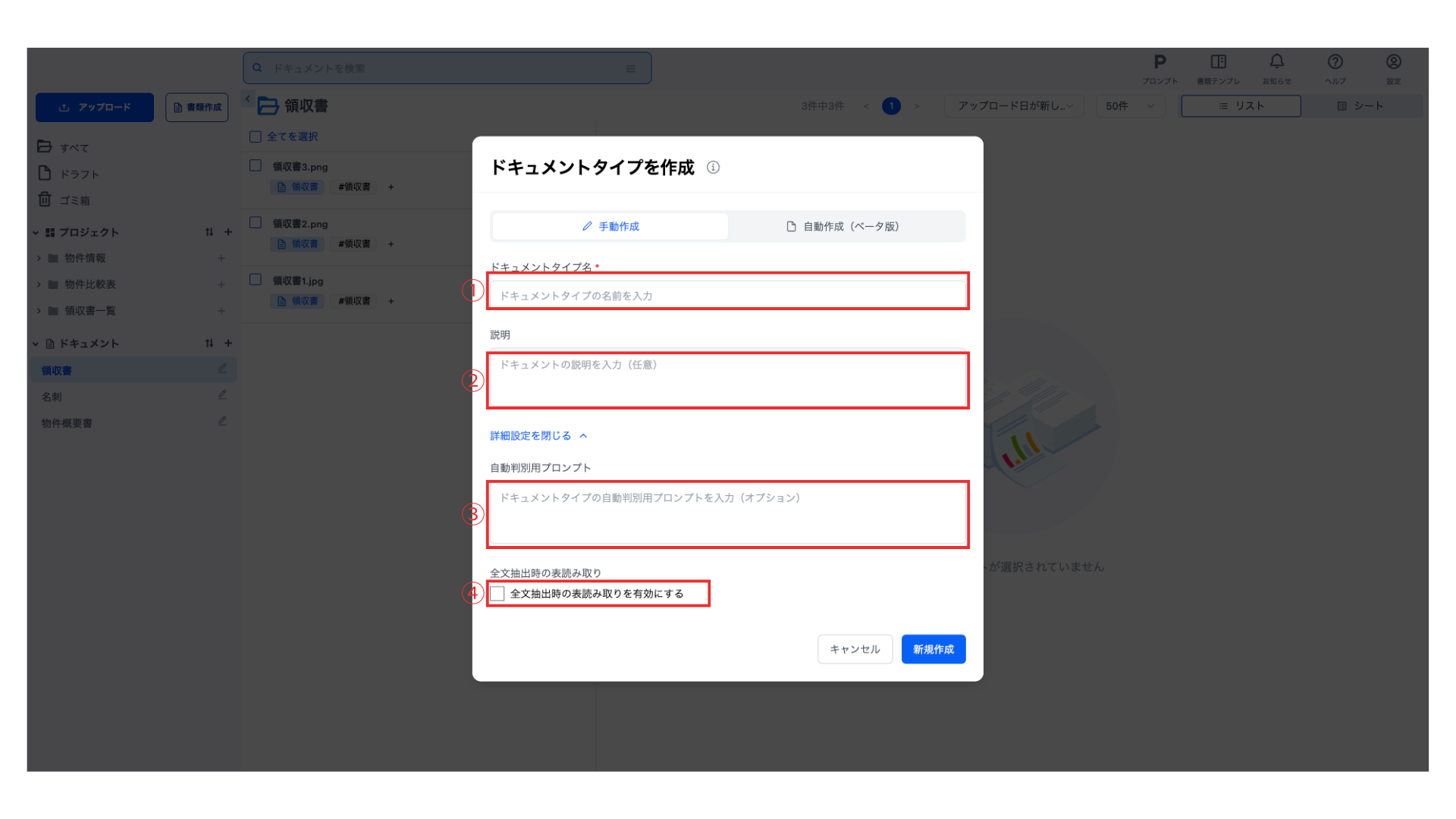 ドキュメントタイプ名を入力し、必要に応じて説明、自動判別用プロンプト、全文抽出時の表読み取り、設定します。