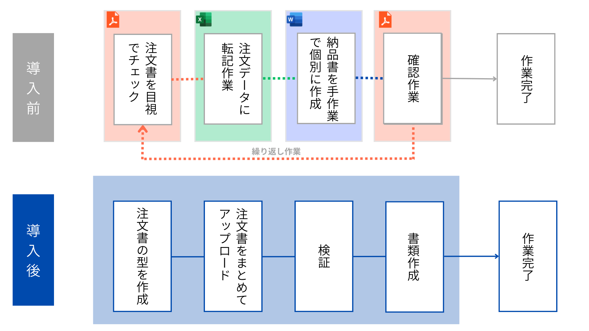 ドキュメントフォースを利用することで、あらかじめドキュメントの型のようなものを作成するだけで、上記の作業を大幅に効率化でき、作業者は注文書をアップロードし、簡単な操作をするだけで注文データと納品書を作成できます。