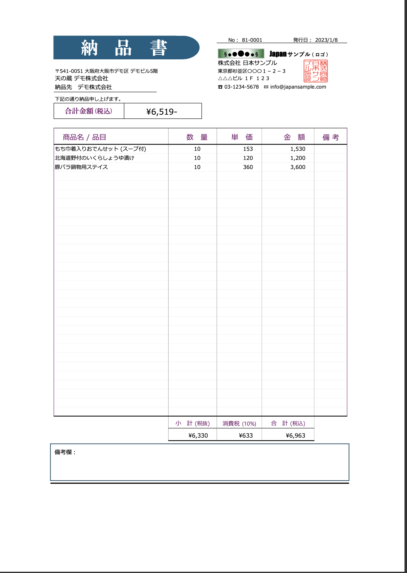 納入先住所 | 〒541-0051大阪府大阪市デモ区デモビル5階 |