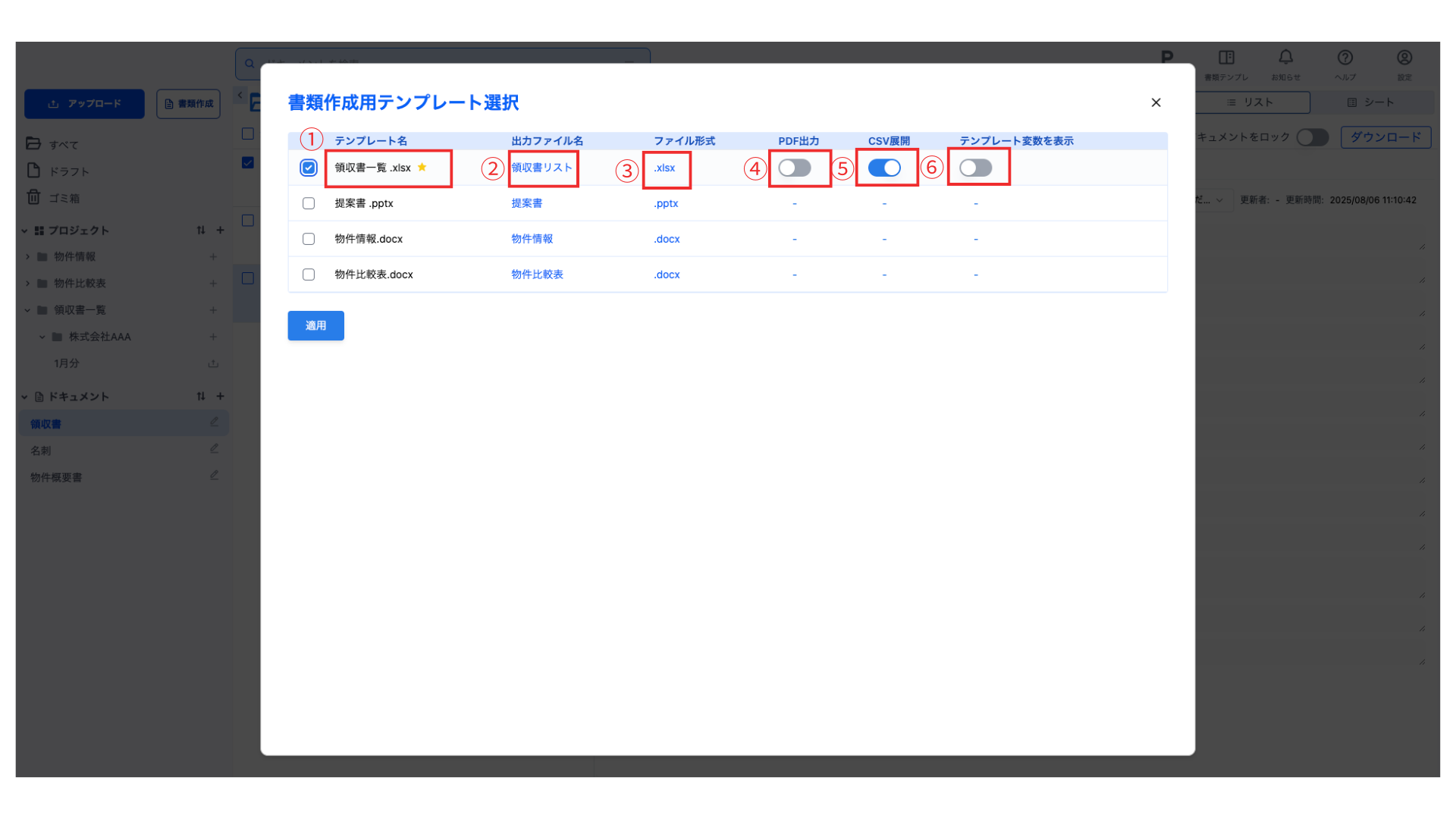 書類作成用テンプレートを選択し、「適用」をクリックすると、テンプレート置換のプレビューが表示されます。