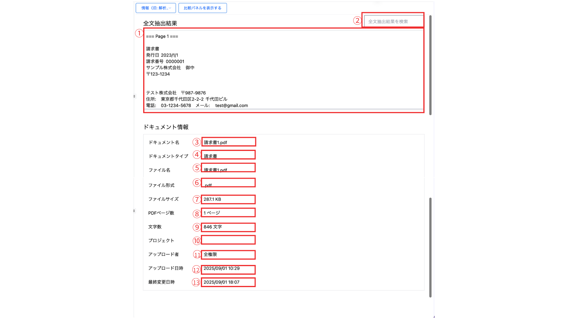 ドキュメントの全文抽出の結果や、ドキュメント自体の情報などが確認できます。