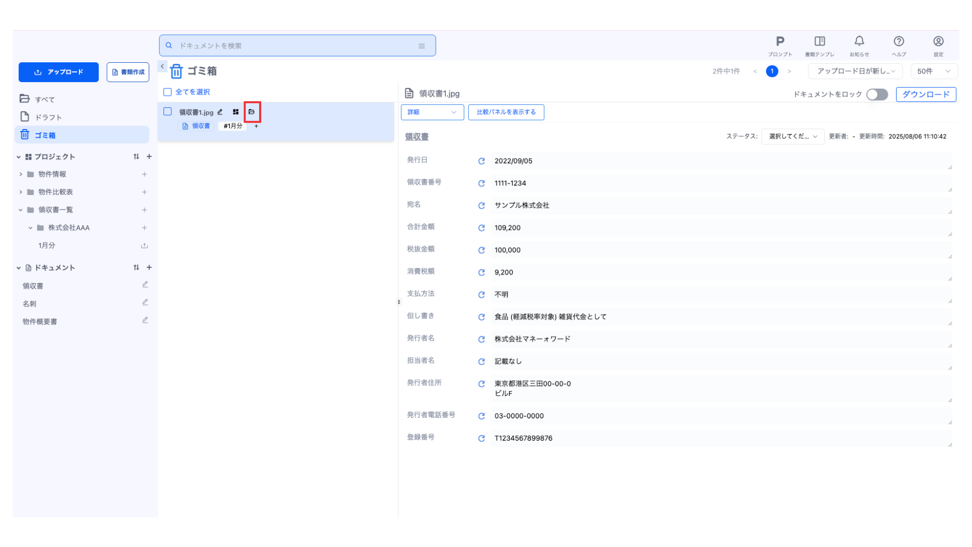 復元されたドキュメントは元のドキュメントタイプやプロジェクトを維持した状態で復元されます。