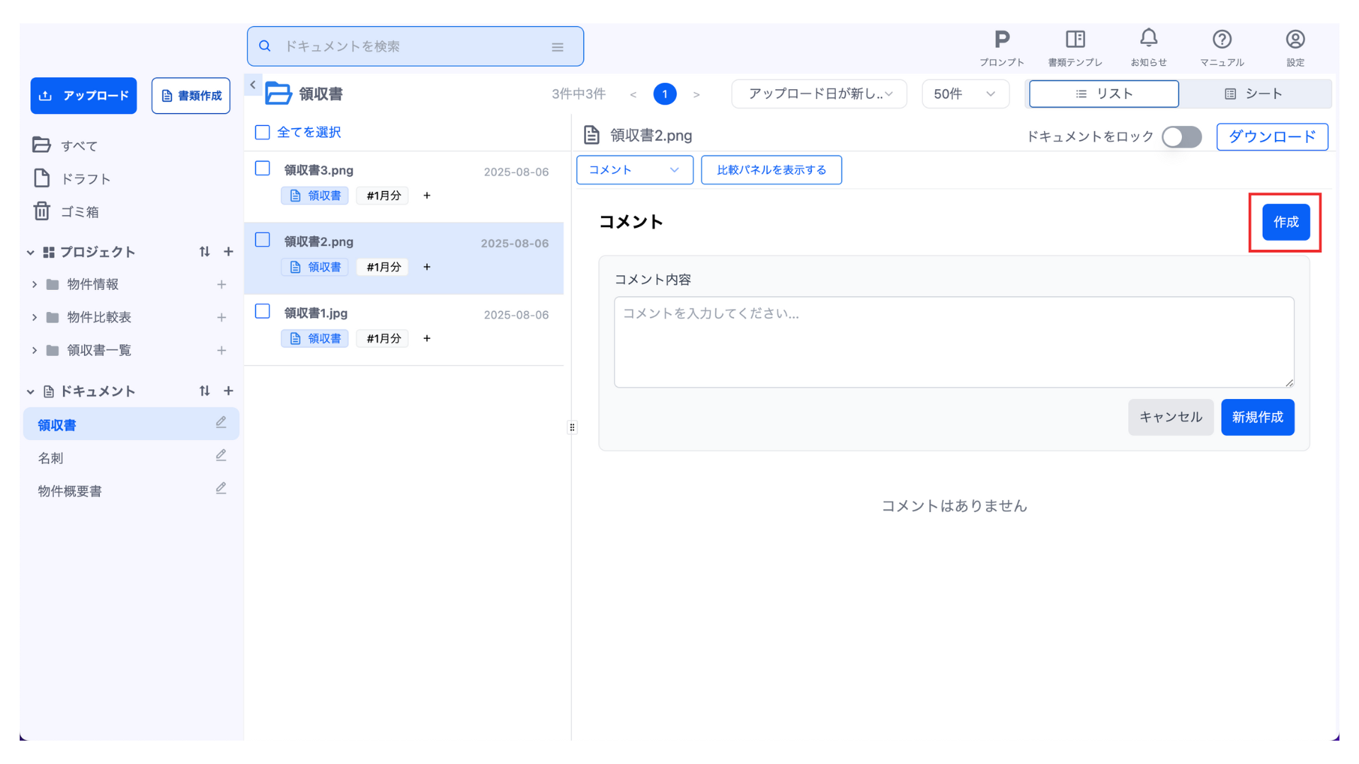 「作成」ボタンをクリックすると、コメントを新規作成できます。