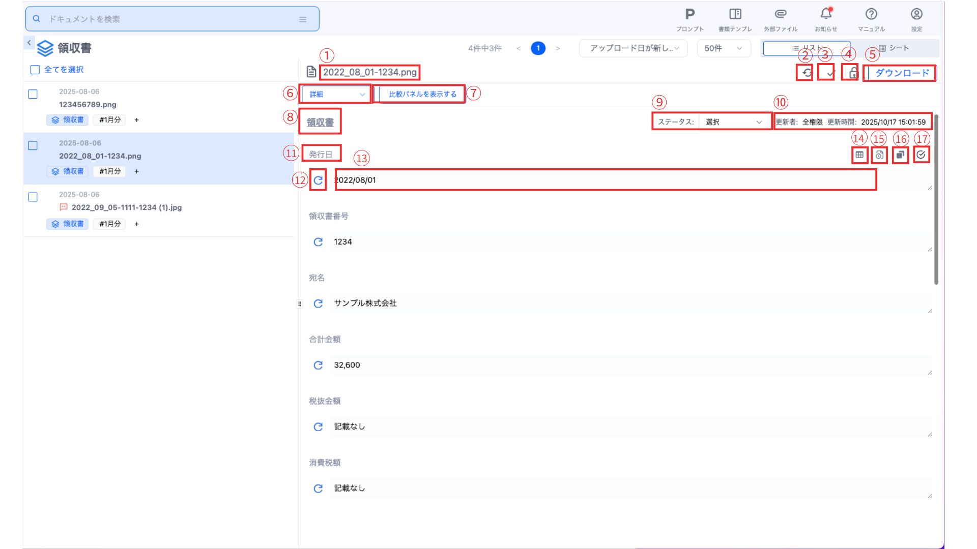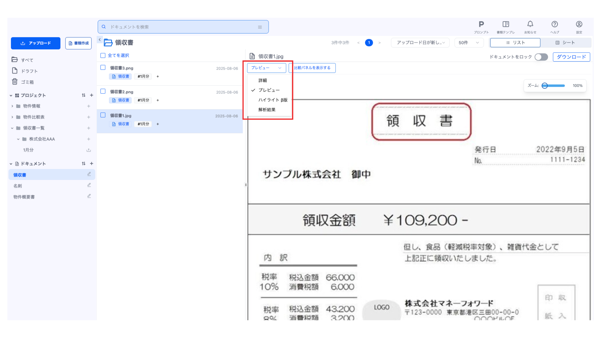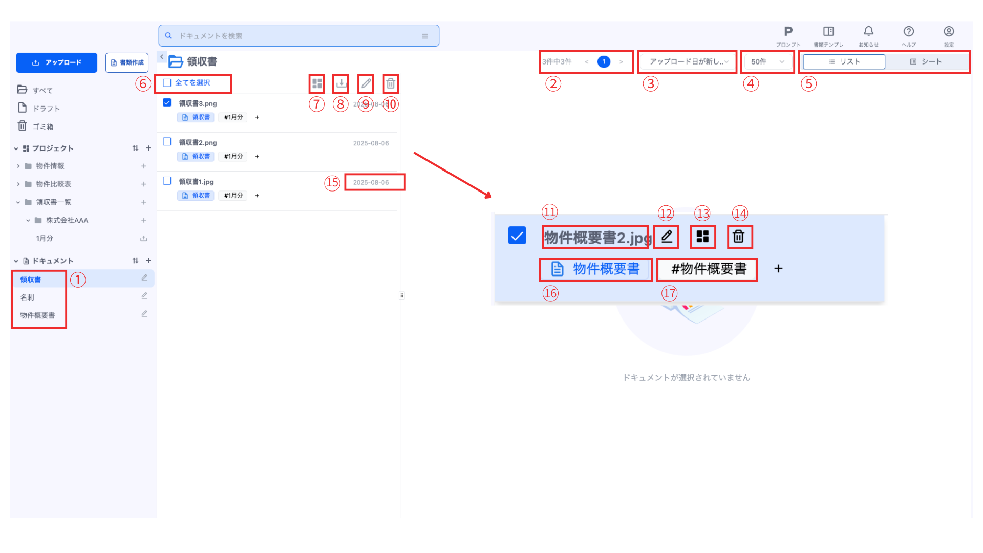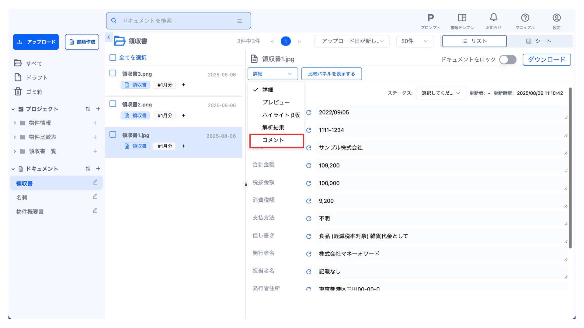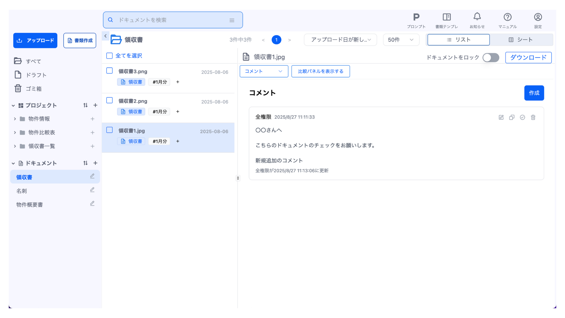 ドキュメント一覧よりドキュメントを選択すると、ドキュメントの詳細を確認できます。