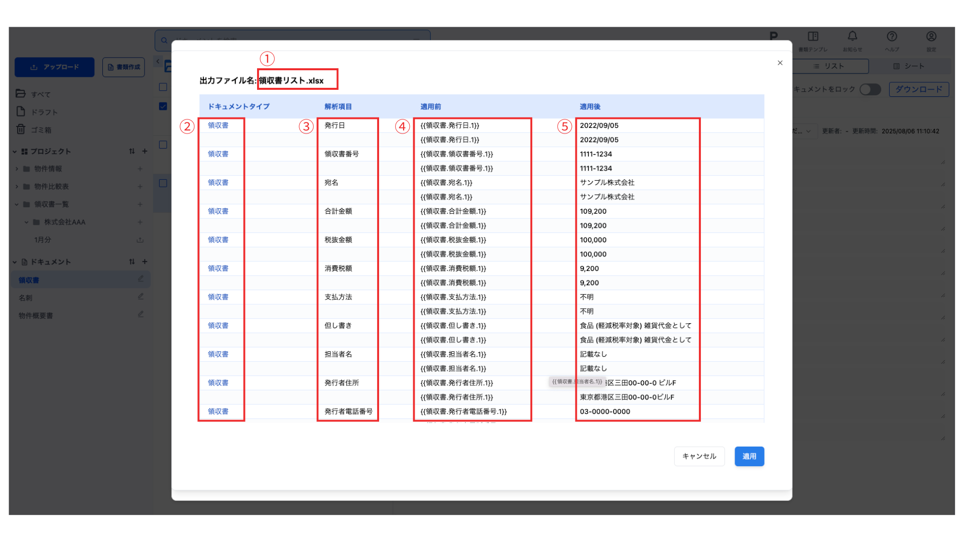 書類作成用テンプレートに登録されているテンプレート変数に対して、ドキュメントの解析結果を置換した値です。