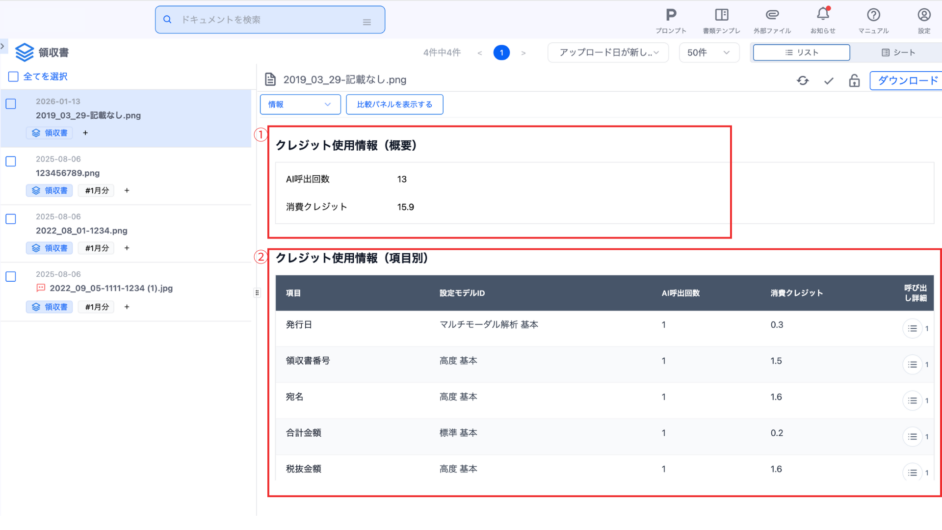 ①クレジット使用情報(概要)では、対象のドキュメントの解析の消費クレジットとAIの呼び出し回数の合計を確認できます。