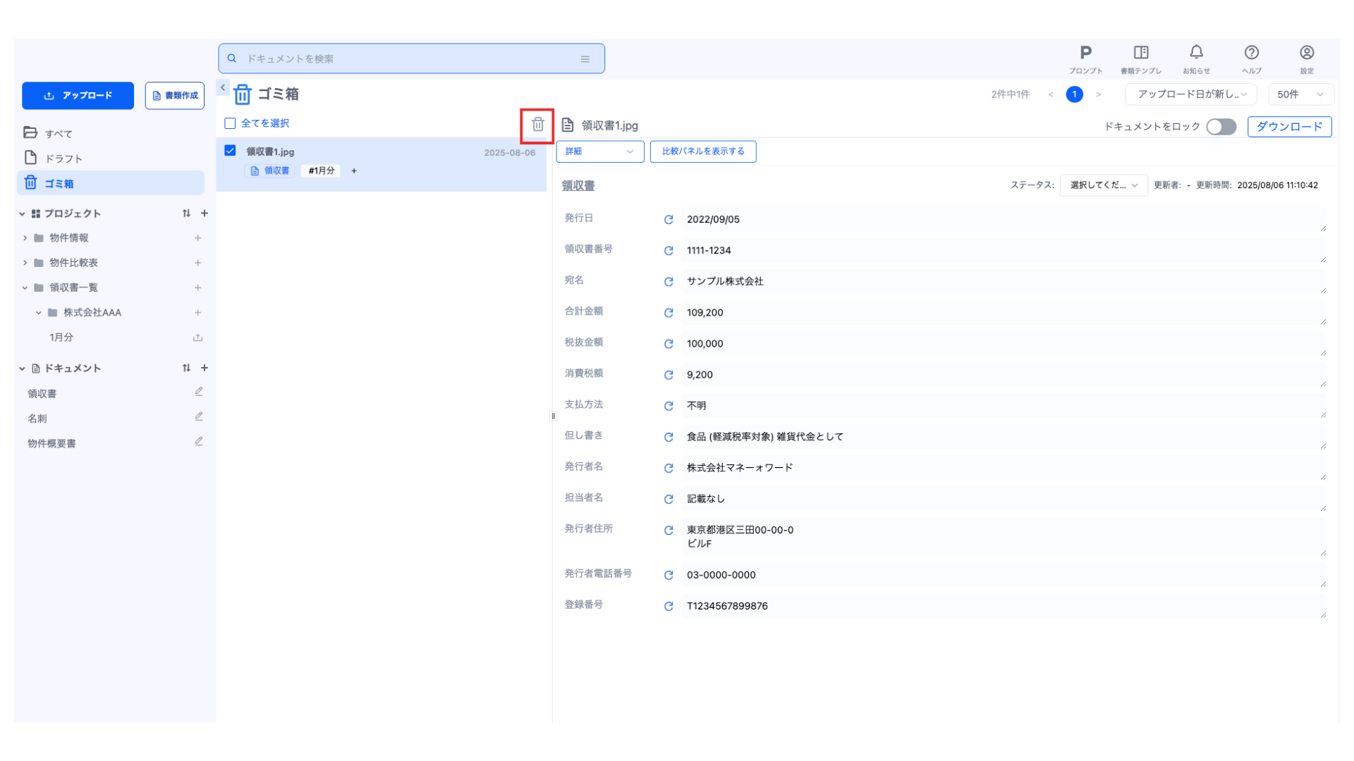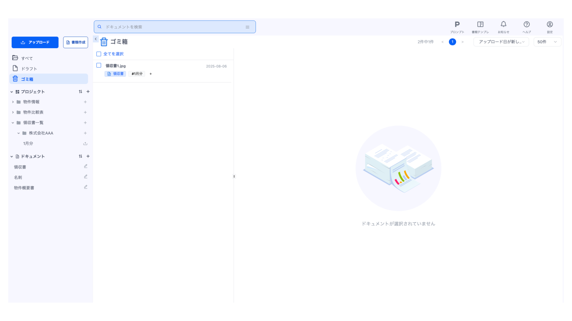 ドキュメントを完全に削除したい場合は、完全に削除したいドキュメントを選択して、「🗑️」ボタンをクリックしてください。