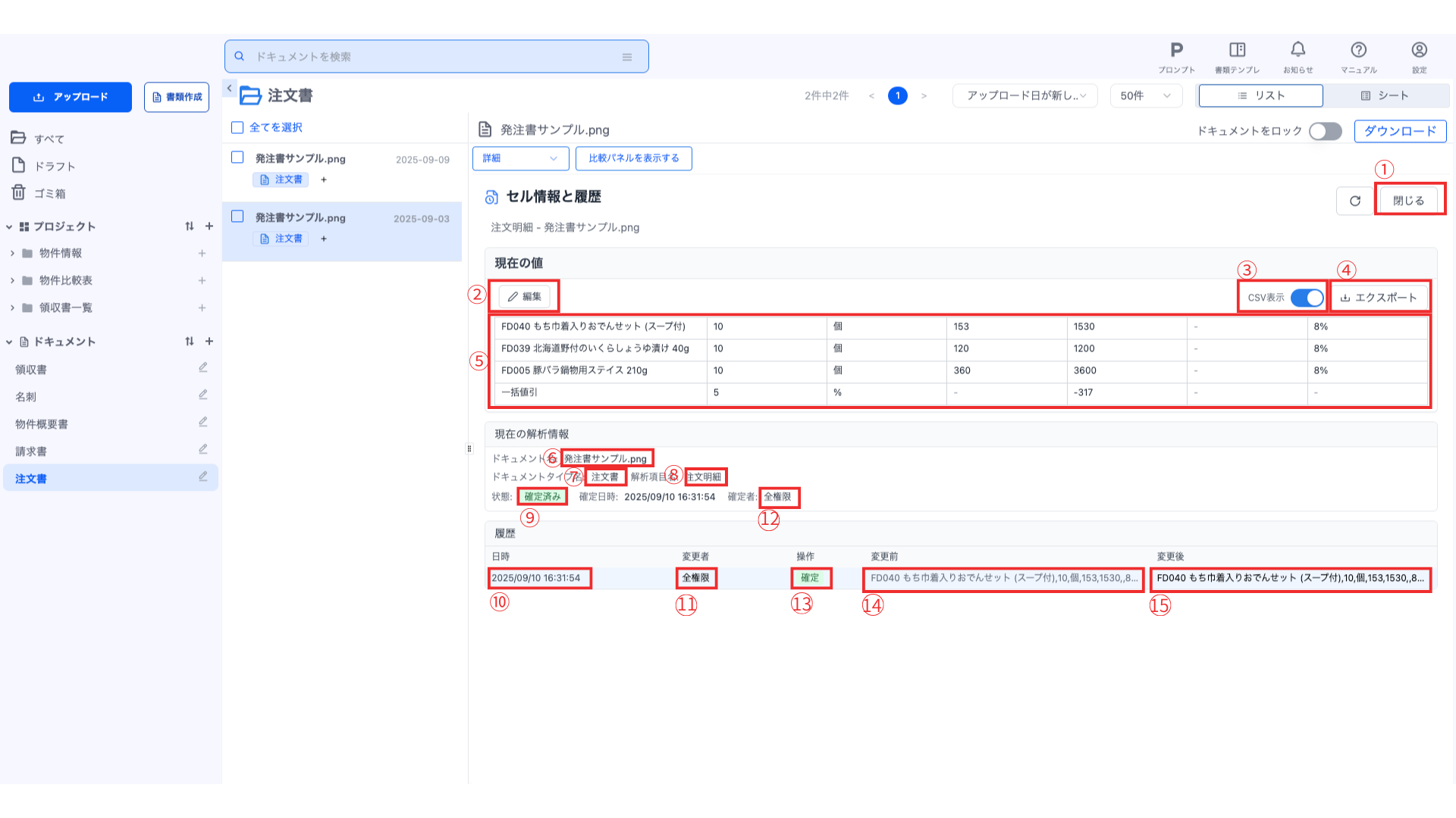 解析結果が変更された場合は「手動編集」、解析結果が確定された場合は「確定」が表示されます。