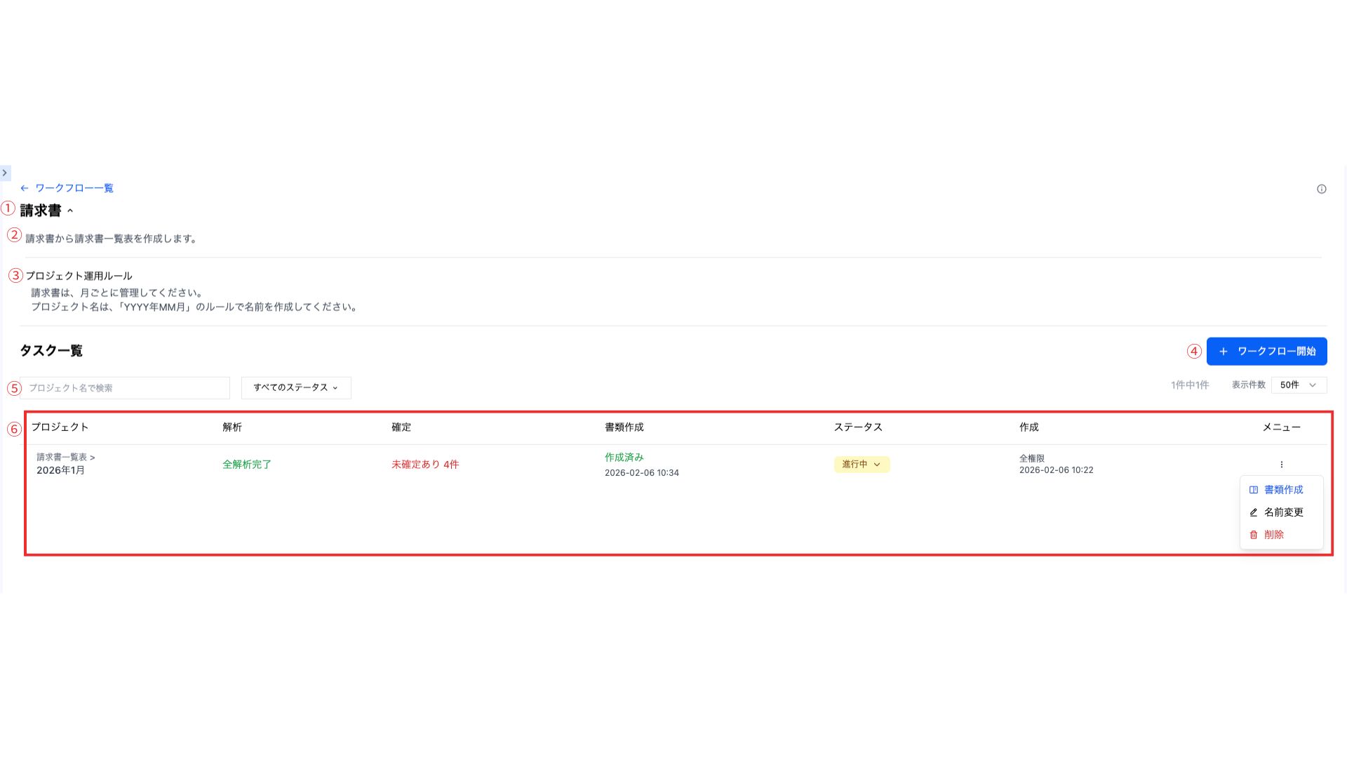 作成済み:タスク内で1度でも書類作成が実行された場合に作成日時とともに表示されます。
