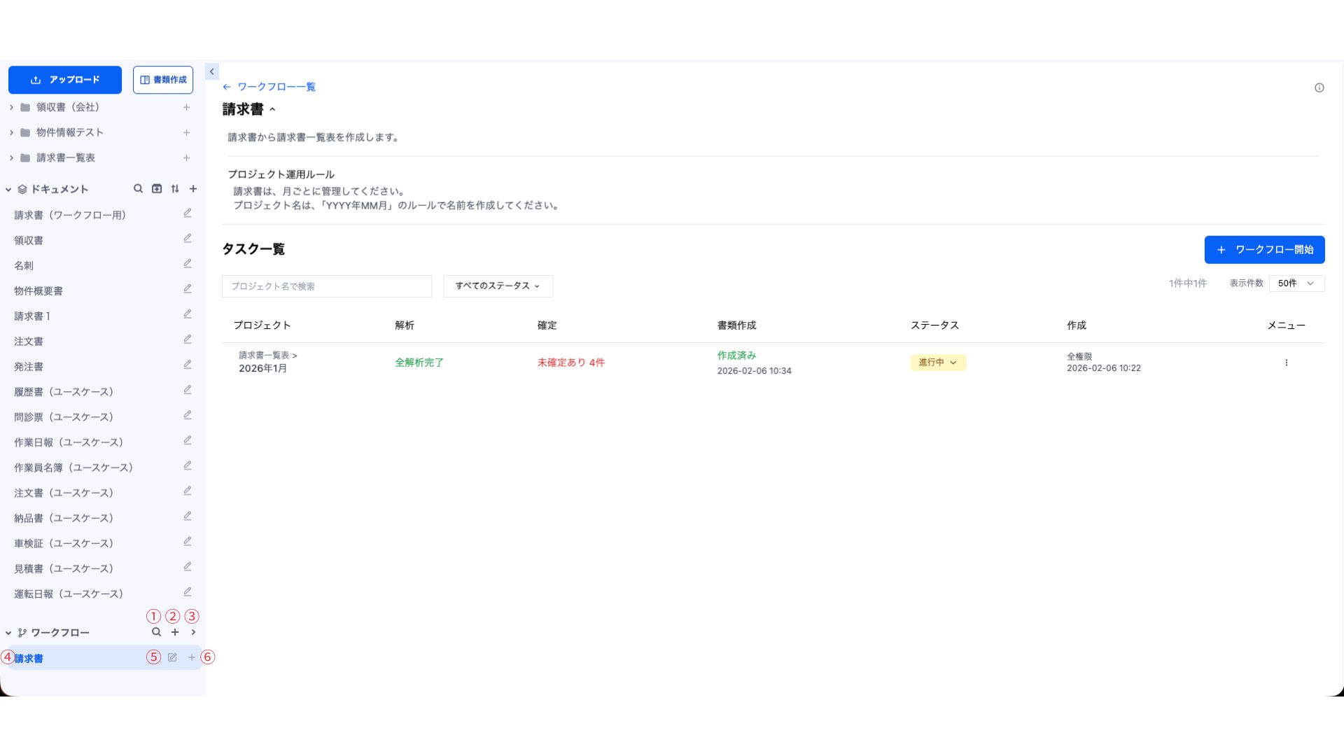 一方で、タスクは必ずいずれか1つのプロジェクトと関連することから、【ワークフローでタスクを進める】ということは【特定のプロジェクトに対してドキュメントをアップロードする】という作業を含むため、結果的にタスクはプロジェクト単位で管理されます。