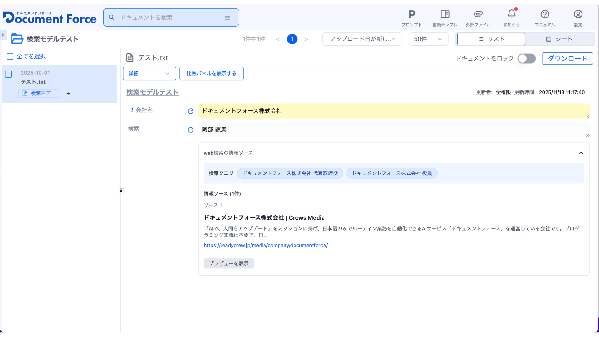 「会社名」は従来通り、アップロードされたドキュメントからのみ参照されるのに対して、「代表者経歴」はあらかじめ取得した「会社名」を利用する形で、結果的にWeb検索に特化するような指示を作成することができます。