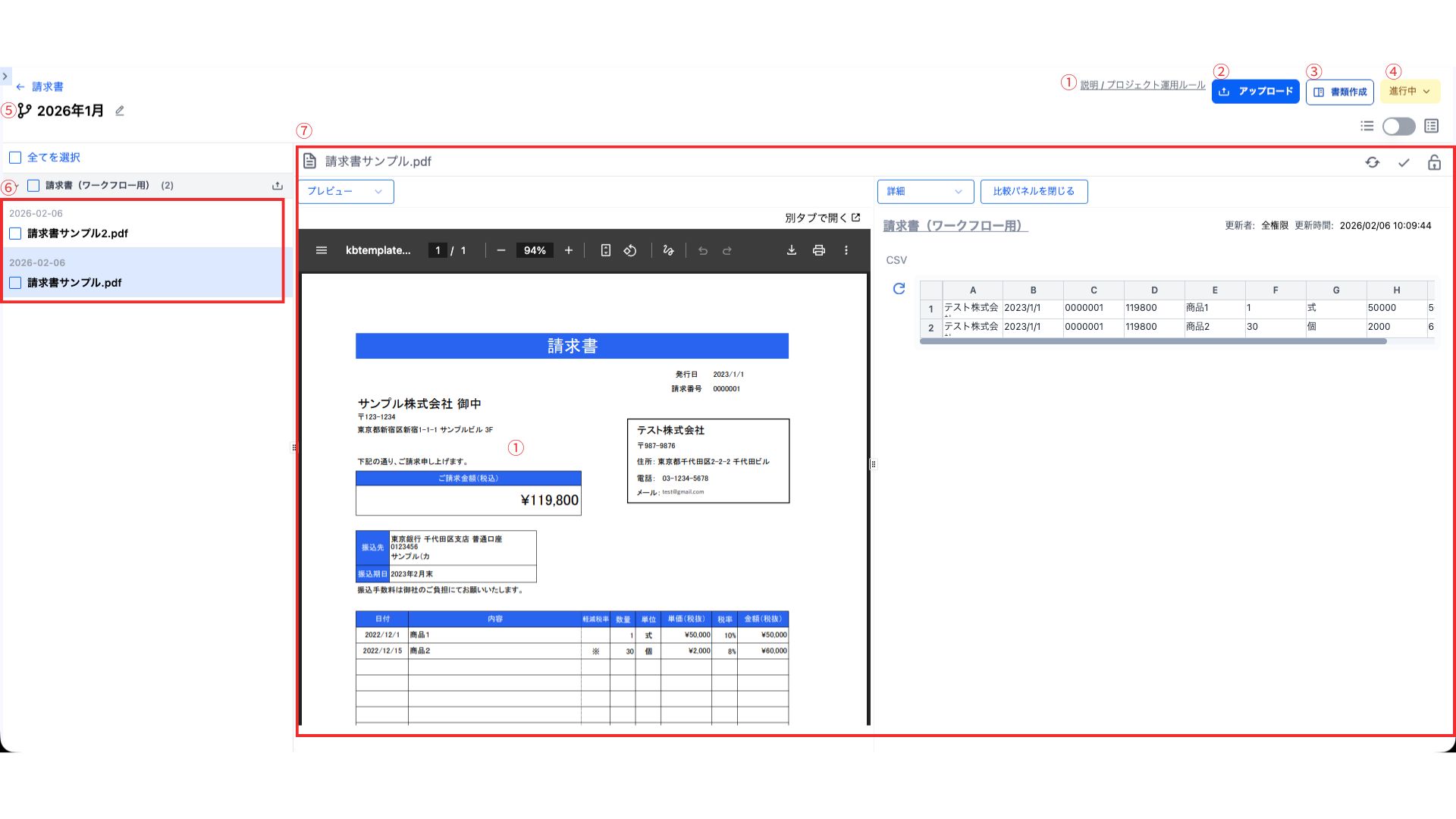 対象となるドキュメントタイプが複数設定されている場合は、それぞれのドキュメントタイプごとにアップロードエリアが表示され、ドキュメントタイプごとにファイルをアップロードすることができます。また、アップロード時はファイルそのままのアップロードに加えて、PDF・画像(結合・分割)機能も使用することができます。