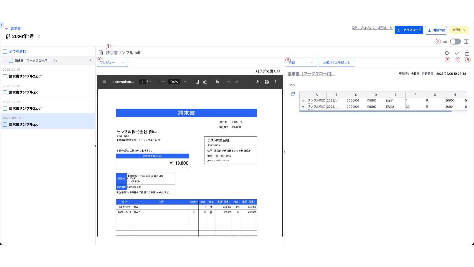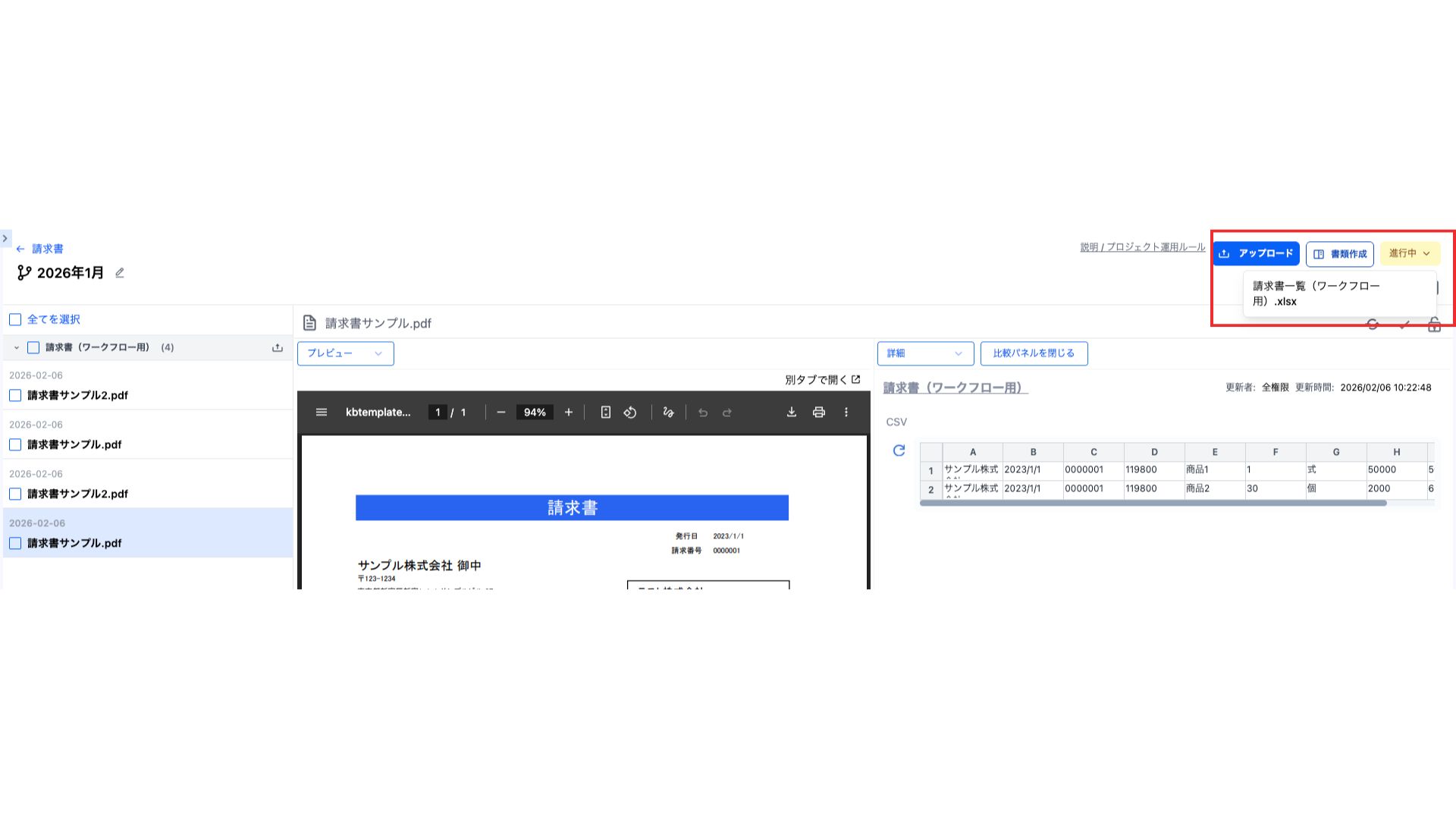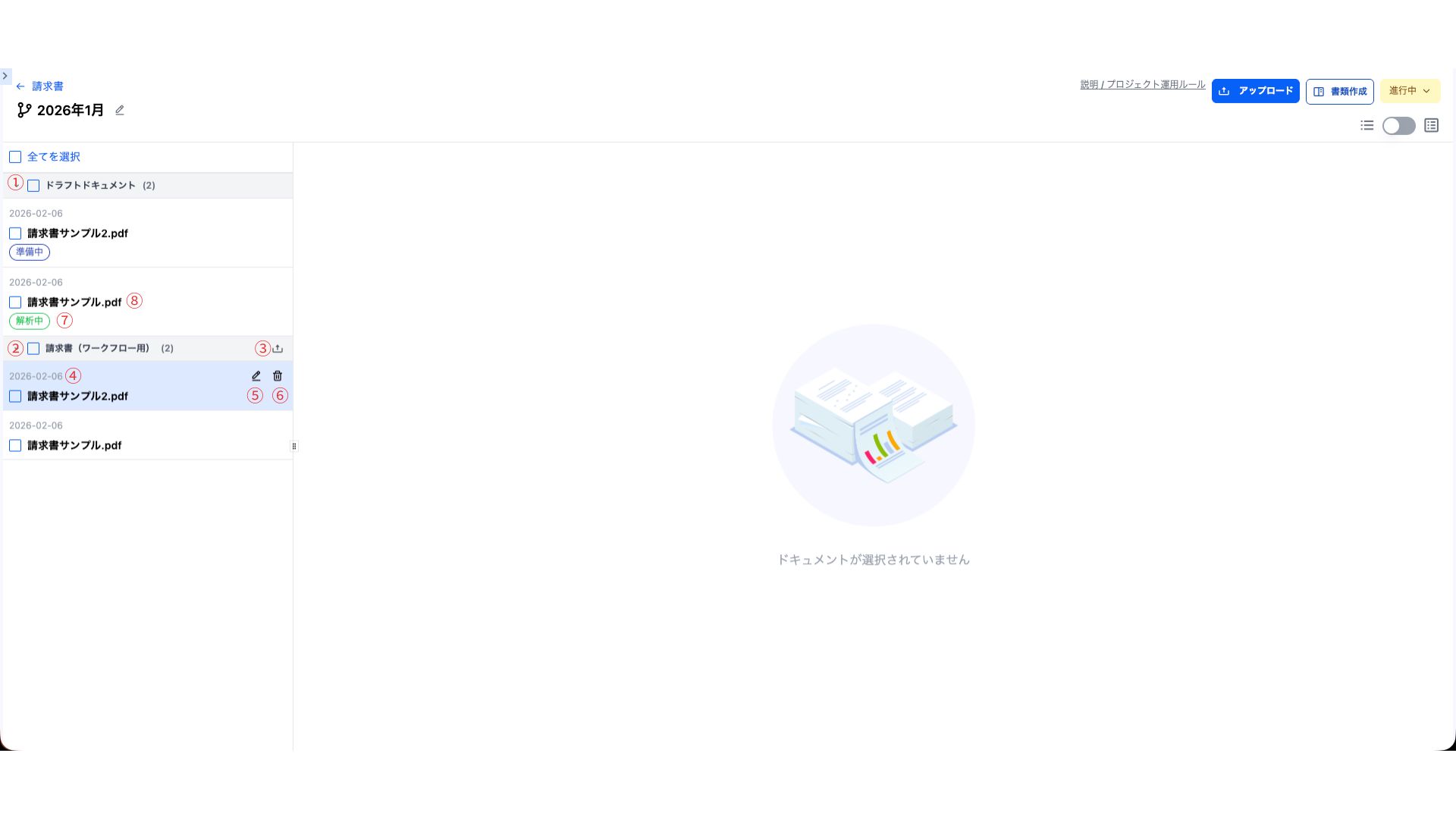 タスク詳細画面では、ドキュメントタイプごとにアップロードされたドキュメントが整理されます。また、ドキュメント一覧には解析中のドキュメントも表示され、解析進捗のステータスをリアルタイムで確認することもできます。