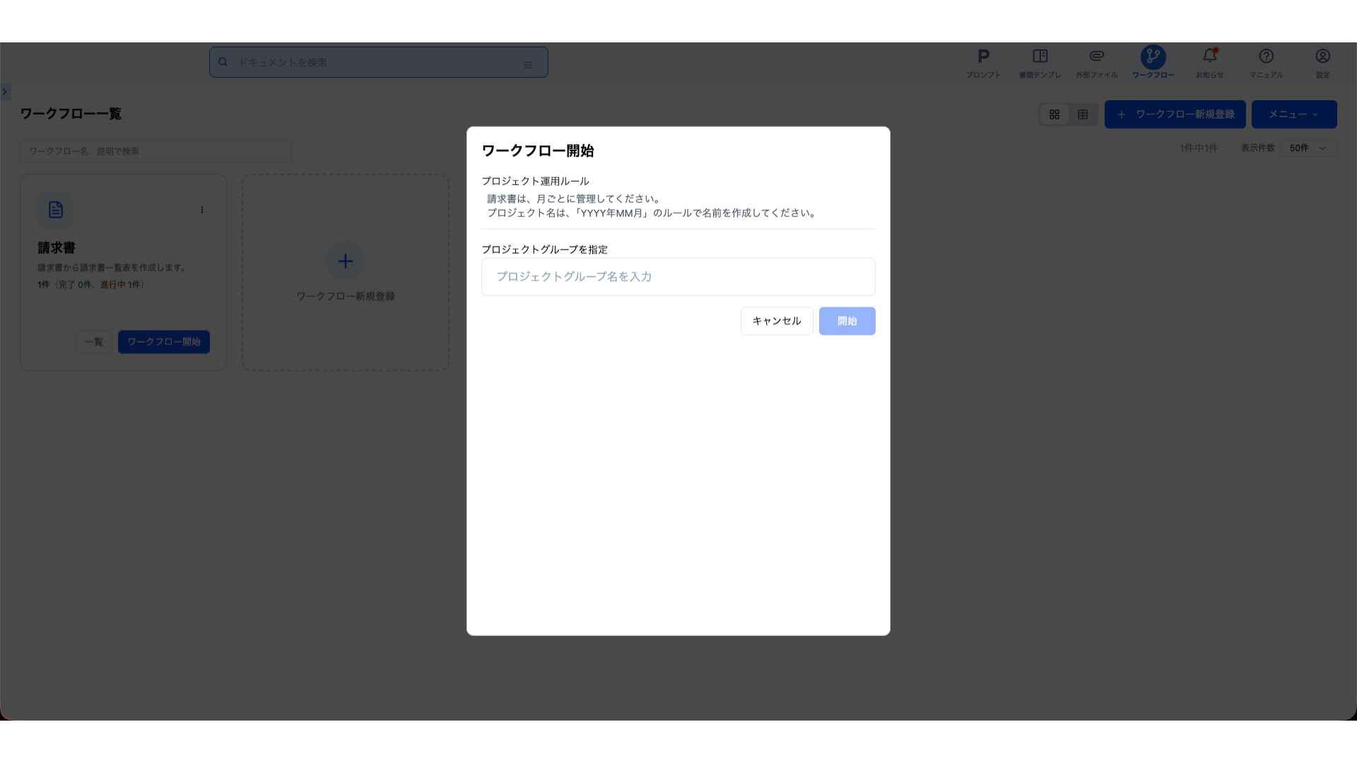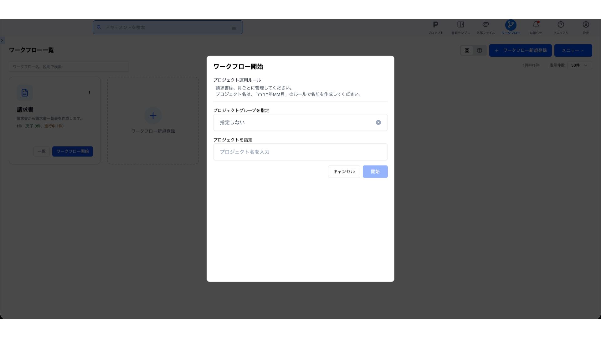 またタスクには開始と終了があり、一般的にはプロジェクトを作成し、1つ目のドキュメントをアップロードするタイミングがタスクの開始時点であり、書類の作成が完了する、またはタスクのステータスが完了となるタイミングをタスクの終了と考えます。ワークフローを開始すると、まずはタスクに紐づくプロジェクトを指定します。