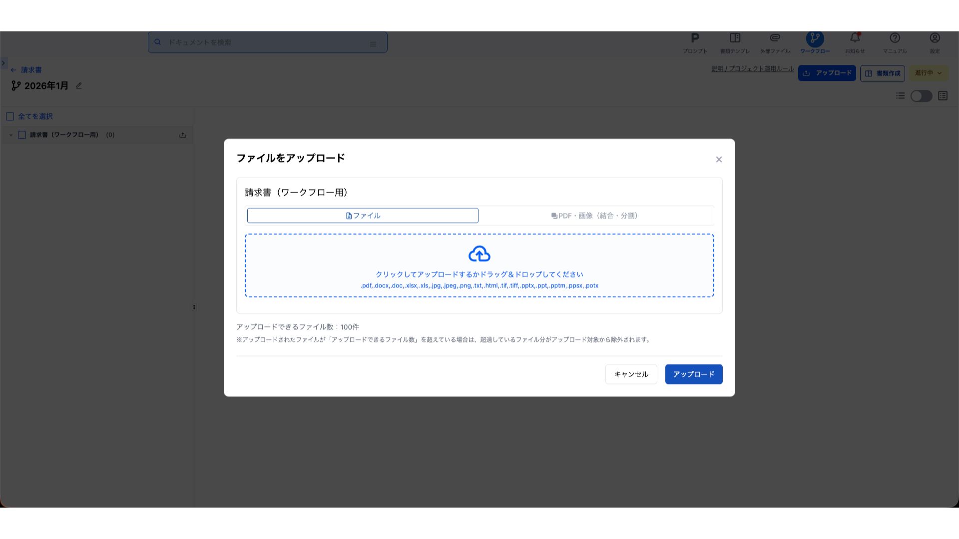 ワークフロー機能におけるファイルのアップロードでは、あらかじめ定義されたドキュメントタイプのみがアップロード対象となります。
